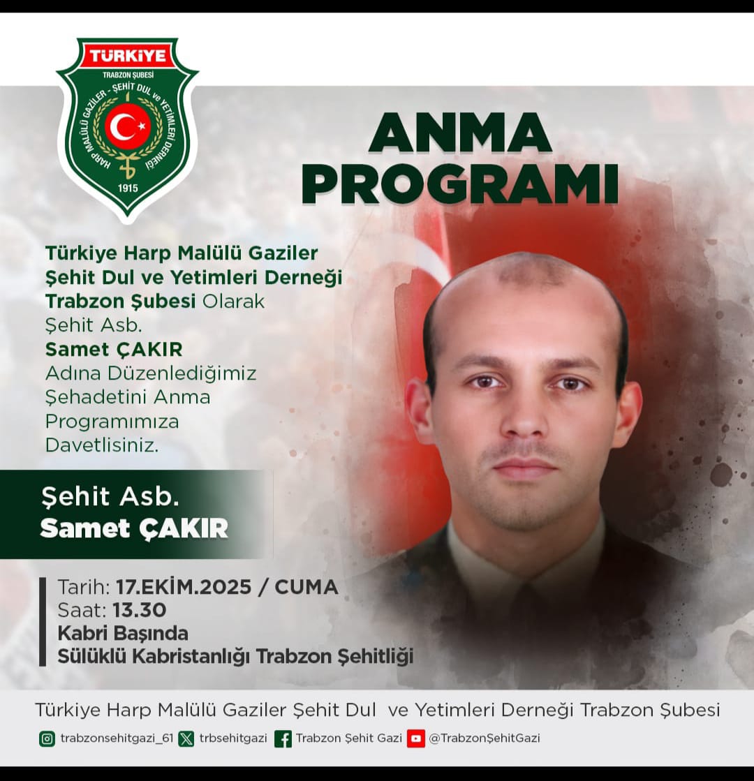 Şehit Astsubay Samet Çakır için düzenlenecek anma programı, 17 Ekim Cuma günü saat 13.30’da Trabzon Sülüklü Kabristanlığı’ndaki şehitlikte gerçekleştirilecek. Astsubay Günü’nde gerçekleşecek bu anlamlı törende, silah arkadaşları, komutanları, ailesi ve sevenleri şehidimizin kabrine karanfil bırakıp dualar edecek. Anma törenine tüm Trabzon halkı davet ediliyor.