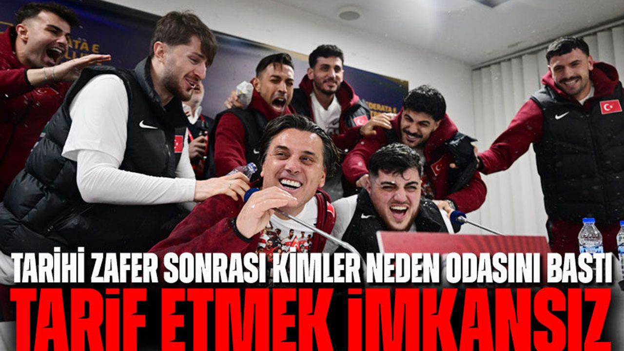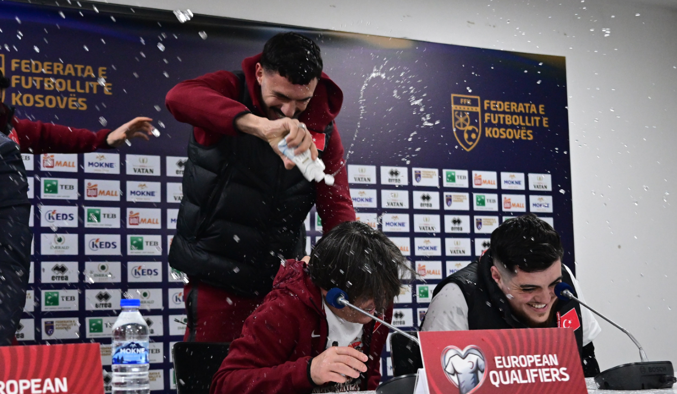 Vincenzo Montella'nın basın toplantısının son bölümünde millî futbolcularımız sürpriz yaptı. Dünya Kupası’na katılmanın coşkusunu yaşayan Ay-Yıldızlı futbolcular bir anda toplantı salonuna girerek hocalarını su şişeleriyle ıslattı. Bu sırada renkli görüntüler oluştu.