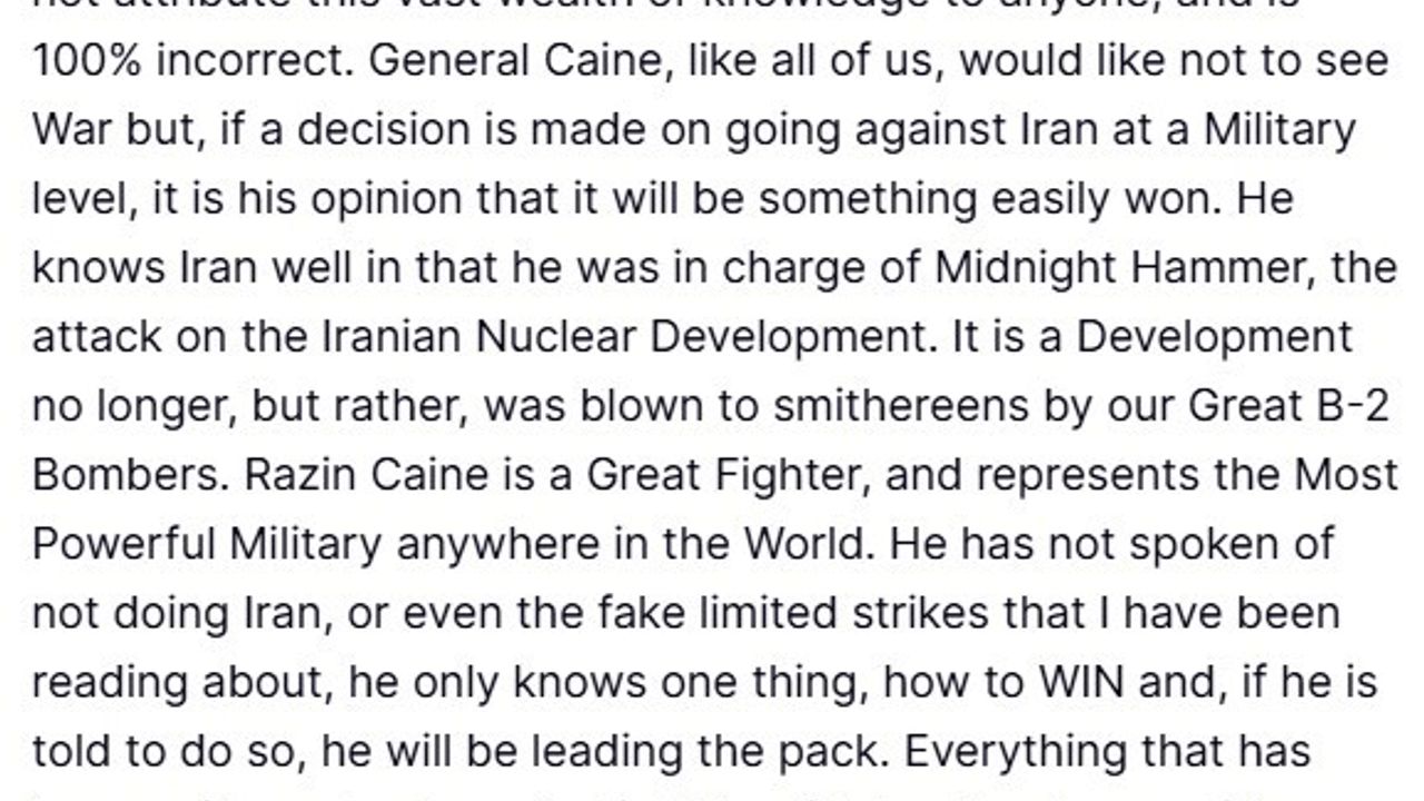 'Razin' olarak da bilinen General Caine'in 'harika bir savaşçı olduğunu' ve 'dünyanın en güçlü ordusunu temsil ettiğini' kaydeden Trump, 'O, İran'a saldırmamaktan ya da basından okuduğum sahte kapsamı sınırlı saldırılardan bahsetmedi. O sadece kazanmayı bilir ve eğer kendisine söylenirse, buna önderlik edecektir' ifadelerini kullandı. İran ile muhtemel savaş senaryolarını ele alan haberlerin gerçeği yansıtmadığını ve kasıtlı olarak yanlış yazıldığını savunan Trump, 'Kararı veren kişi benim. Ben bir anlaşma olmasını, olmamasına tercih ederim. Ancak bir anlaşmaya varamazsak, bu İran ve ne yazık ki halkı için çok kötü bir gün olur. Çünkü İran'ın halkı harika ve iyi insanlar ve böyle bir şeyin onların başına asla gelmemesi gerekir' dedi.