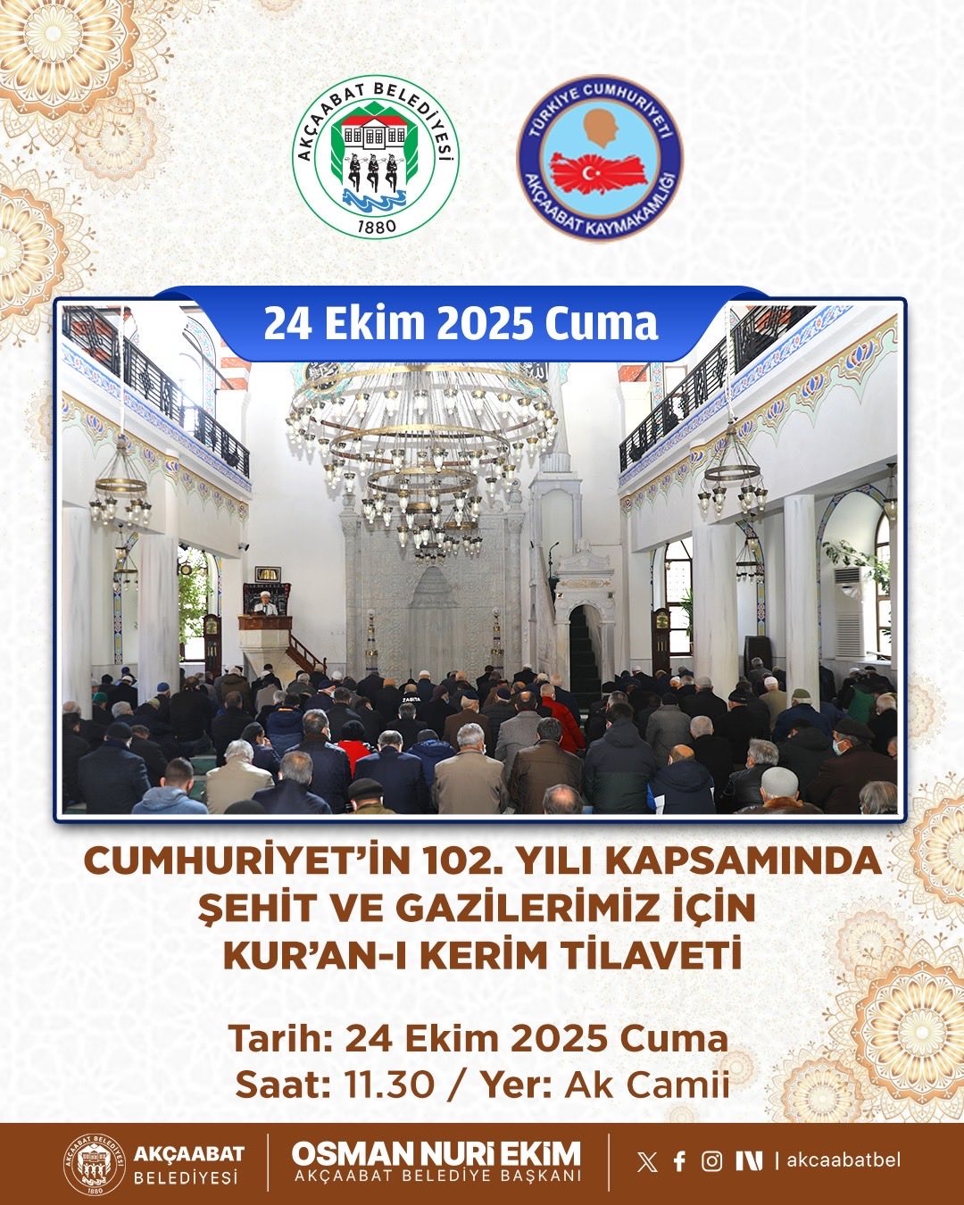 “Cumhuriyet, bize atalarımızdan miras kalan en kıymetli değerdir. Bu emaneti yaşatmak, güçlendirmek ve gelecek nesillere daha güçlü şekilde aktarmak hepimizin ortak sorumluluğudur. Cumhuriyetimizin 102. yılını, milletçe büyük bir gurur ve coşkuyla kutluyoruz. Tüm hemşehrilerimizi bu anlamlı programa davet ediyorum.”