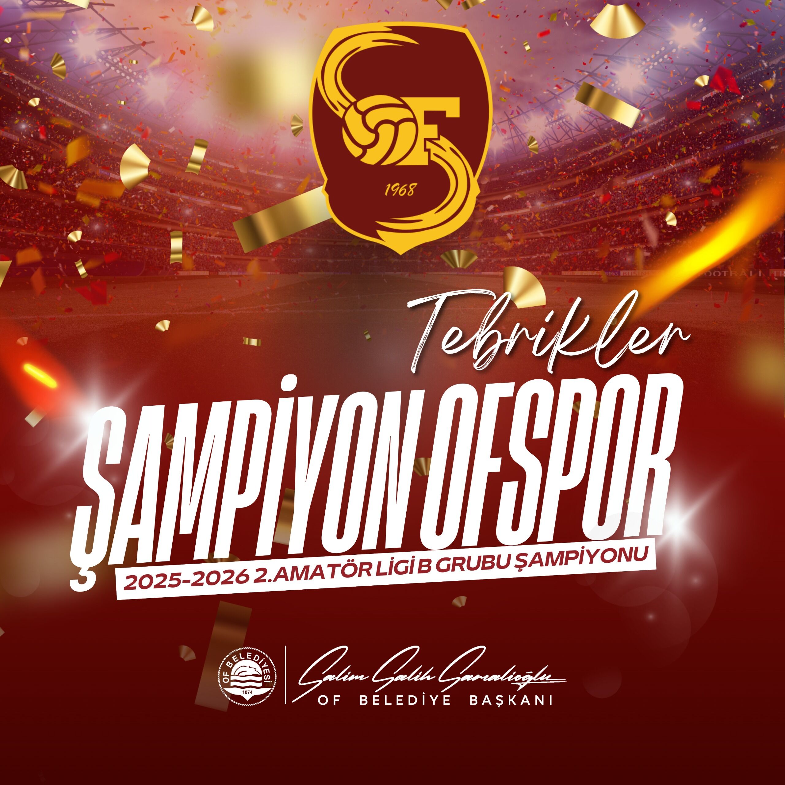 "Tebrikler Şampiyon Ofspor! Bu başarının gerçek sahipleri; sahada ter döken sporcularımız ve her daim yanlarında olan taraftarlarımızdır. 2025–2026 2. Amatör Ligi B Grubu Şampiyonu olan takımımızı yürekten kutluyor, sporcularımızın alınlarından öpüyorum."