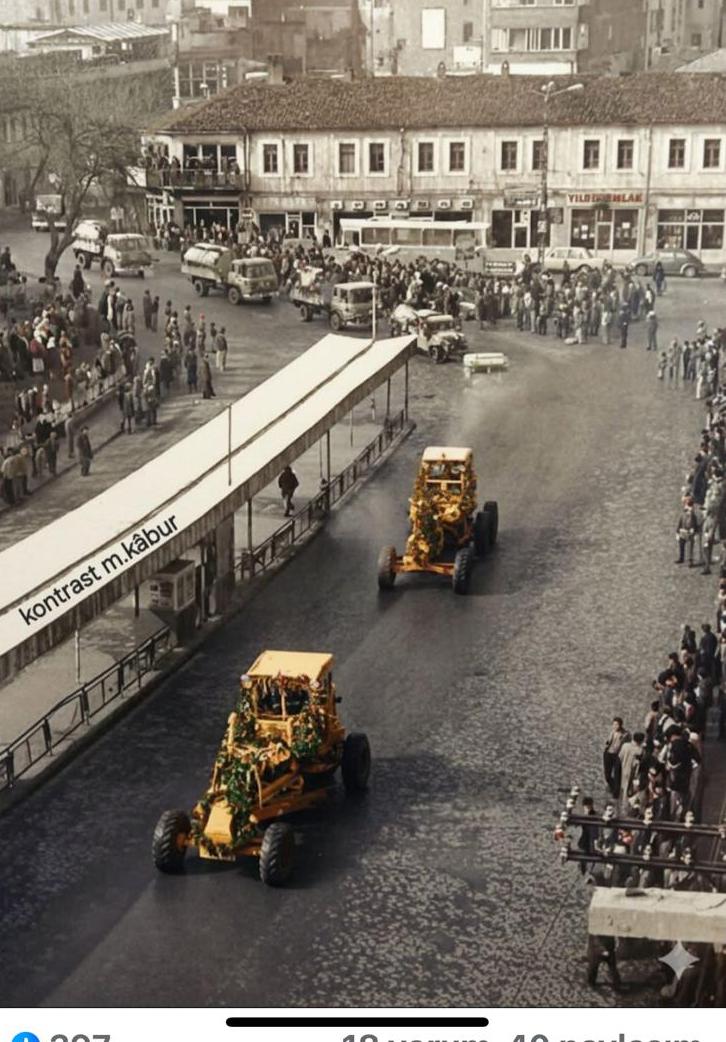Trabzon’da bayram töreni. Meydan parkı etrafı. Arkada Suluhan henüz yıkılmamış. Trabzon Belediyesi ve kurumların araçları kortej geçişinde. Ama dikkat çeken bir nokta var. Bayramda coşku var. Şimdi ki Bayramlara halkın katılımı tamamen azaldı.