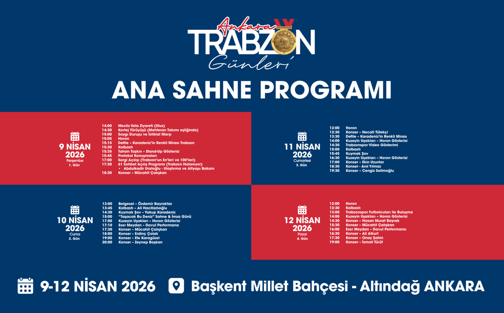 9–12 Nisan’da Başkent Millet Bahçesi’nde düzenlenecek Trabzon Günleri; köklü tarihinden aldığı güçle kültür, sanat, gastronomi, spor ve iş dünyasını aynı çatı altında buluşturarak, konserler, söyleşiler ve çeşitli etkinliklerle zenginleştirilen programıyla dört gün boyunca kapsamlı bir buluşmaya ev sahipliği yapacak.