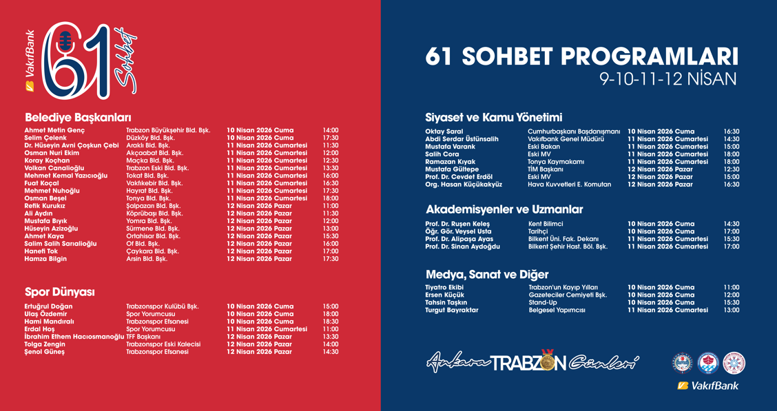 Trabzon Günleri, yalnızca kültürel bir etkinlik olmanın ötesine geçerek; akademi, iş dünyası ve kamu temsilcilerini buluşturan bir fikir platformuna dönüşüyor. “VakıfBank61 Sohbet” özel oturumlarla Trabzon’un geleceği, yatırımları ve vizyonu da masaya yatırılacak.