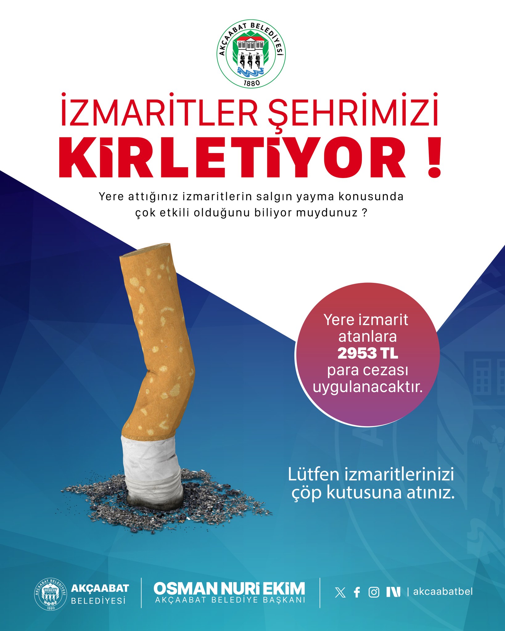 Başkan Ekim, sosyal medya hesabından yaptığı duyuruda, “Şehir estetiğini bozan, çevre kirliliğine neden olan ve halk sağlığını tehdit eden yere atılan sigara izmaritleri konusunda hemşehrilerimizin duyarlı olmasını önemle rica ediyoruz. Yere izmarit atılması; çevre ve görüntü kirliliğine yol açmakta. Salgın hastalıkların yayılmasını kolaylaştırmakta. Doğal yaşamı olumsuz etkilemektedir. İlgili mevzuat gereğince, yere izmarit atanlara 2 bin 953 TL idari para cezası uygulanacaktır. Temiz, sağlıklı ve yaşanabilir bir Akçaabat için lütfen izmaritlerinizi çöp kutularına bırakınız.”