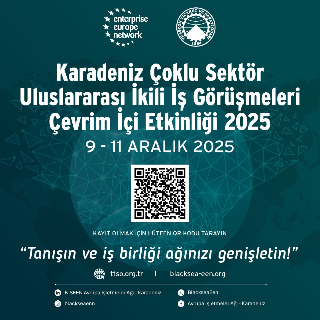 Trabzon Ticaret ve Sanayi Odası, Avrupa İşletmeler Ağı Projesi kapsamında 9 – 11 Aralık 2025 tarihlerinde Karadeniz Çoklu Sektör Uluslararası İkili İş Görüşmeleri Etkinliğini çevrim içi formatta gerçekleştirecek. Avrupa Birliği ülkeleri başta olmak üzere toplam 55 ülkede yayınlanan etkinlik, dünya genelinden alıcıları, tedarikçileri, üreticileri ve araştırma kurumlarını bir araya getirerek uluslararası ticaret ve iş birliği fırsatları sunacak.