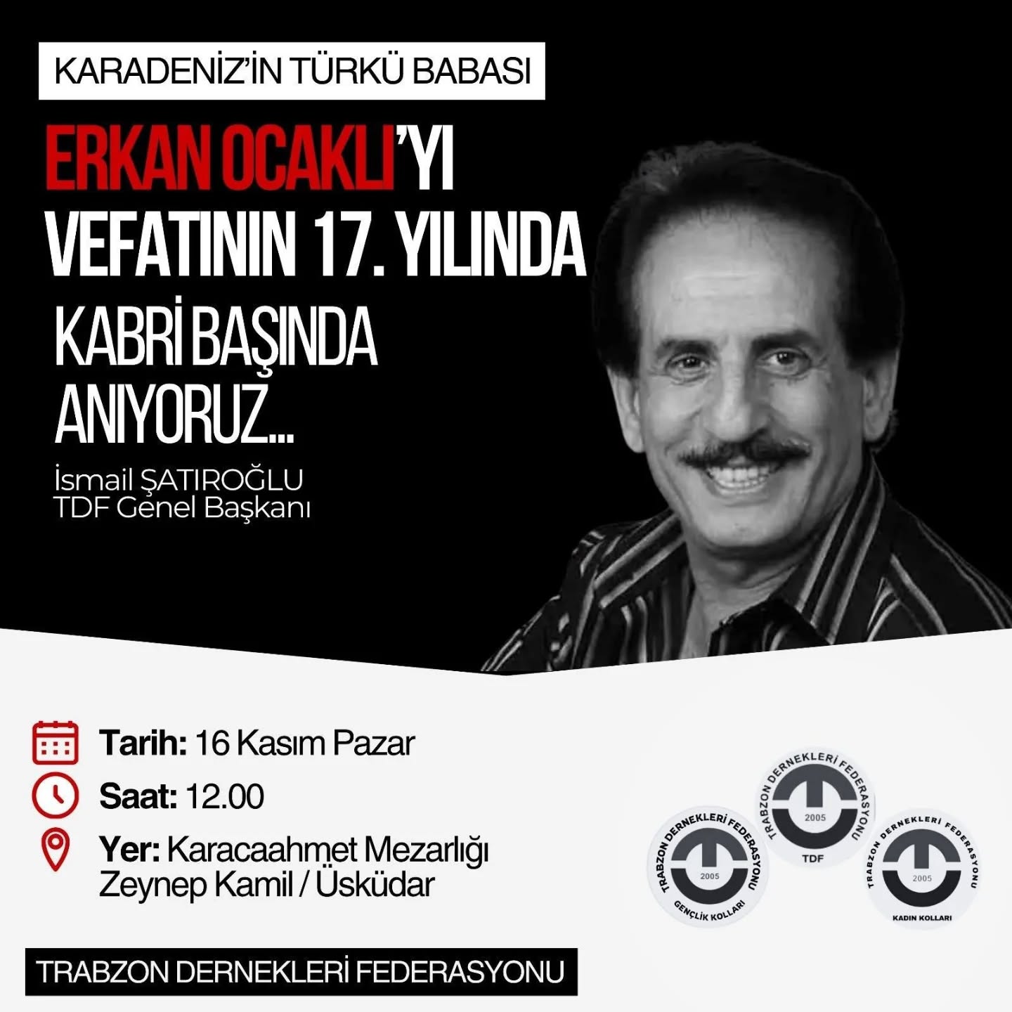 Trabzon Dernekleri Federasyonu, Karadeniz müziğinin değerli isimlerinden Erkan Ocaklı’yı ölüm yıl dönümünde anacak. Ocaklı bugün saat 12.00’de İstanbul Karacaahmet Mezarlığı’ndaki kabri başında dualarla anılacak. TDF Genel Başkanı İsmail Şatıroğlu, Karadenizlileri anmaya davet etti.
