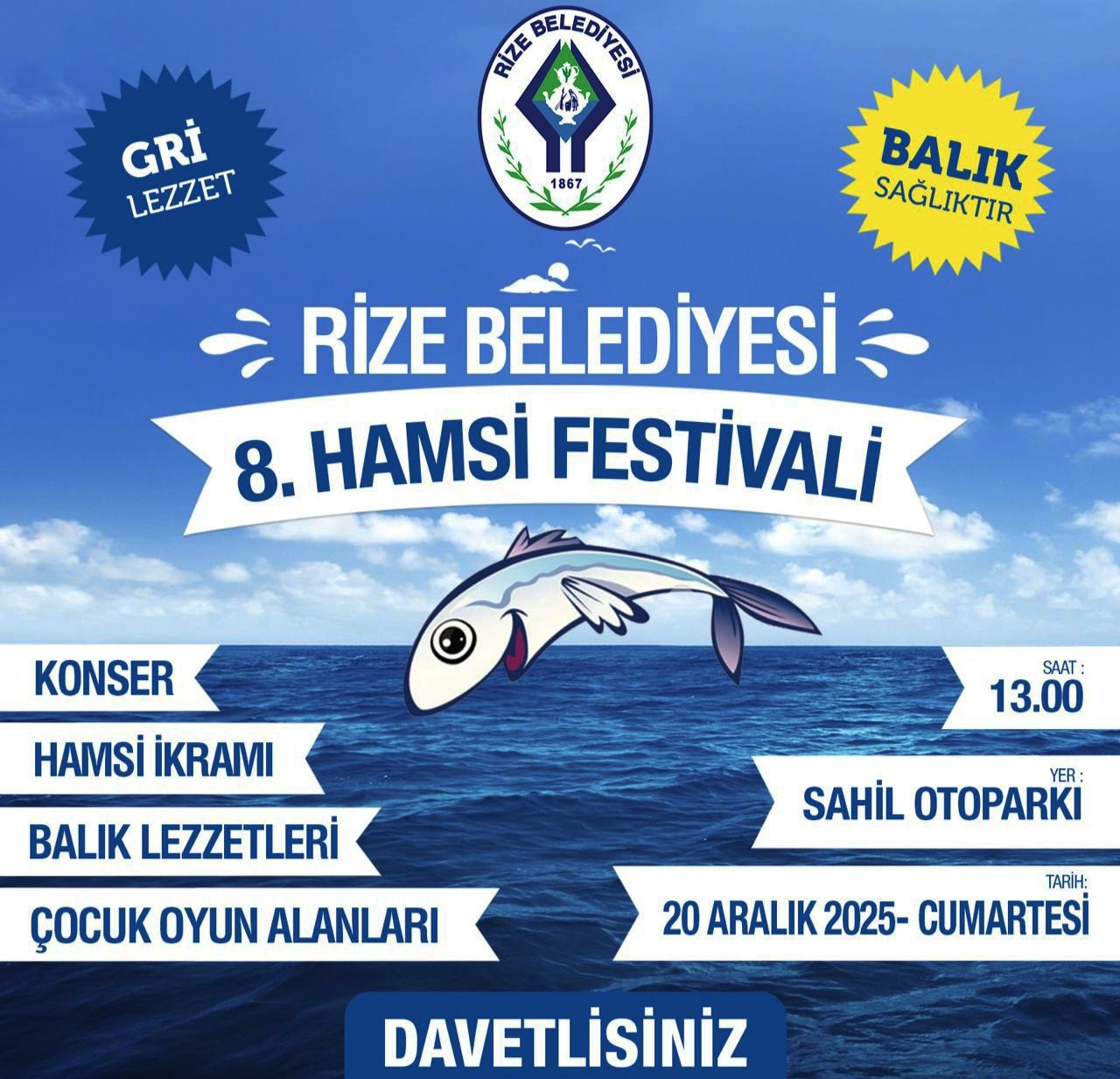 Rize Belediyesi tarafından geleneksel hale getirilen 8. Hamsi Festivali bugün Rize Sahil Otoparkı’nda düzenleniyor. Saat 13.00’te başlayacak festivalde hamsi başta olmak üzere Karadeniz mutfağının özgün lezzetleri tanıtılacak. Müzik dinletileri, çocuk oyun alanları ve hamsi ikramı festival programında yer alıyor.