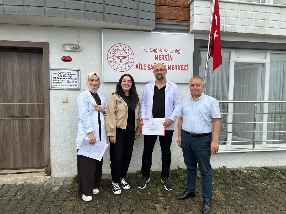 Akçaabat’ta, 3-9 Eylül Halk Sağlığı Haftası kapsamında, 2025 yılı içerisinde obezite taramasını en yüksek oranda gerçekleştiren Mersin Aile Sağlığı Merkezi, İlçe Sağlık Müdürü Dr. Ufuk Öztürk ve Sağlıklı Hayat Merkezi Sorumlusu Dr. Aslıhan Özemre tarafından ziyaret edildi. Ziyarette, merkez çalışanları Dr. Beraat Sağlam ve Hemşire Bahar Can Saka’ya teşekkür belgesi takdim edildi. “Koruyan, Geliştiren Sağlık” anlayışıyla halk sağlığına katkıda bulunan tüm sağlık çalışanlarına teşekkür edildi.