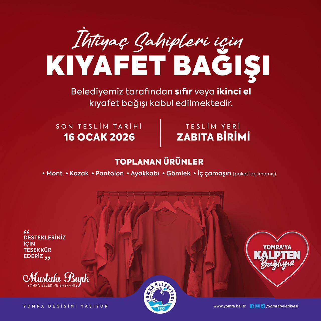 Yomra Belediyesi, kış döneminde ihtiyaç sahiplerine destek sağlamak amacıyla kıyafet bağışı kampanyası başlattı. Kampanya kapsamında Trabzon’un Yomra ilçesinde yaşayan vatandaşlar, sıfır ya da ikinci el, temiz ve kullanıma uygun kıyafetleri belirlenen noktaya teslim edebilecek. Belediye tarafından yapılan bilgilendirmeye göre bağışta bulunmak isteyenler, kıyafetleri yarına kadar belediye binasının giriş katında yer alan Zabıta Birimine teslim edebilecek. Bu süreçte teslim alınacak tüm ürünlerin temiz, düzenli ve yeniden kullanılabilir durumda olması istendi.