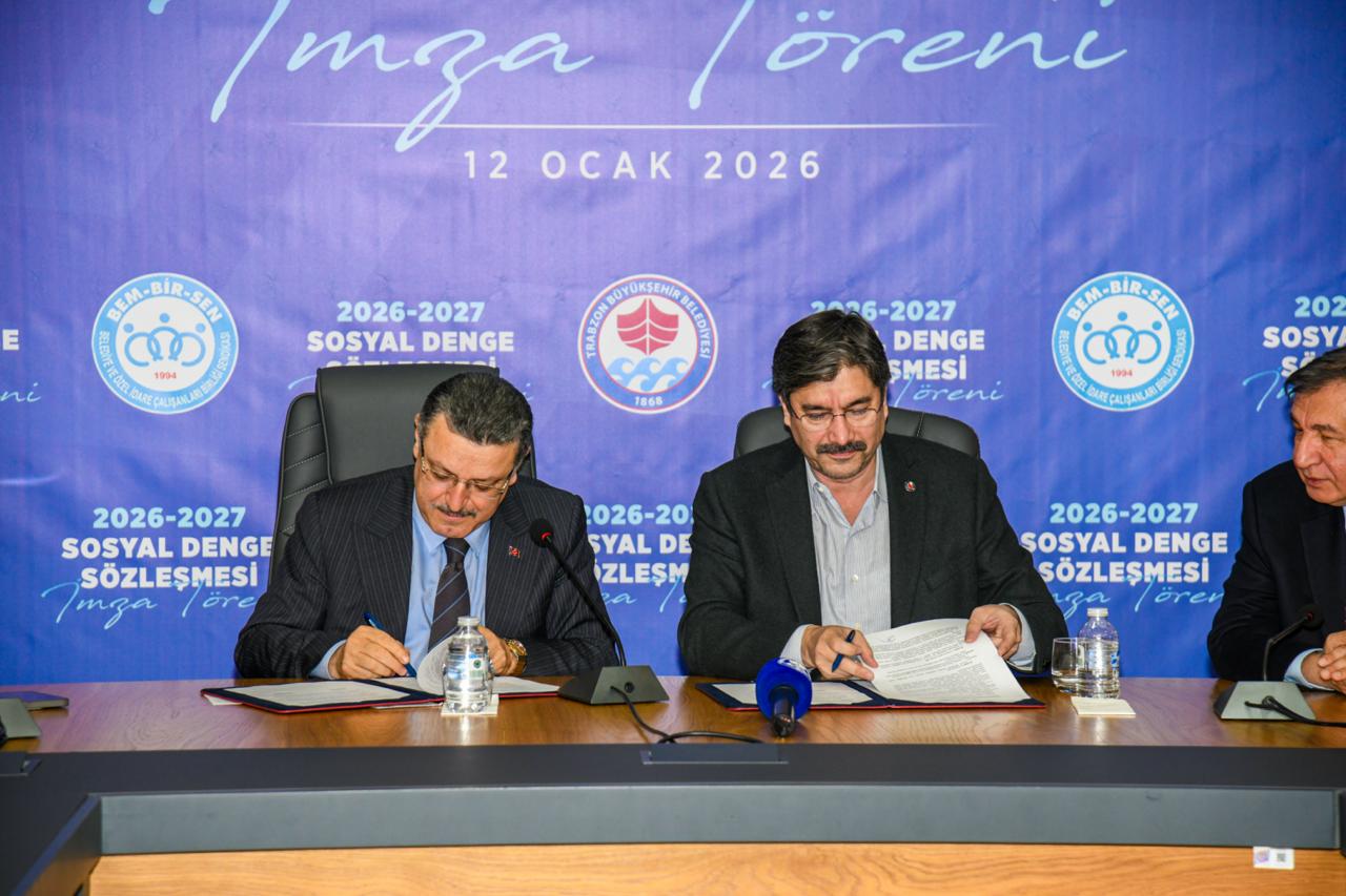 Trabzon Büyükşehir Belediye Başkanı Ahmet Metin Genç, çalışanlarının sosyal ve ekonomik haklarının güçlendirilmesi konusunda önemli adımlar atmaya devam ediyor. Bem-Bir-Sen ile imzalanan Sosyal Denge Sözleşmesi (SDS) kapsamında Büyükşehir ve TİSKİ'de çalışan memurların maaşlarına tavan ücret üzerinden artış yapıldı. Trabzon Büyükşehir Belediyesi ve TİSKİ’de çalışan 1383 memurun sosyal haklardan en üst seviyede yararlanması adına, Trabzon Büyükşehir Belediyesi Toplantı Salonu’nda Büyükşehir Belediye Başkanı Ahmet Metin Genç ve Bem-Bir-Sen Genel Başkanı Levent Uslu arasında imza töreni düzenlendi.