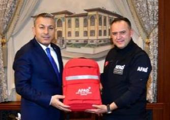 AFAD Başkanlığı Destek Hizmetleri Daire Başkanı Gökhan Çebi Trabzon Valiliğine atanan Tahir Şahin’i ziyaret ederek AFAD çantasının kendisine takdim ederek hayırlı olsun dedi.