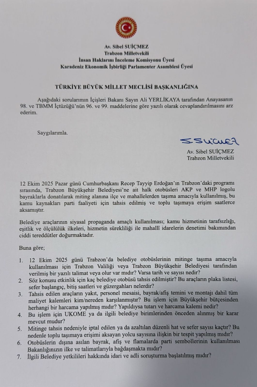 12 Ekim 2025 tarihinde Cumhurbaşkanı Recep Tayyip Erdoğan’ın Trabzon’daki programı sırasında yaşanan otobüs krizi, Meclis gündemine taşındı. CHP Trabzon Milletvekili Sibel Suiçmez, Trabzon Büyükşehir Belediyesi’ne ait halk otobüslerinin, siyasi parti sembolleriyle donatılarak miting alanına taşıma amacıyla kullanılması hakkında İçişleri Bakanı’na yazılı soru önergesi sundu. Suiçmez, yaşanan uygulamanın kamu hizmetinin tarafsızlığı ve eşitlik ilkesini zedelediğini ifade etti.