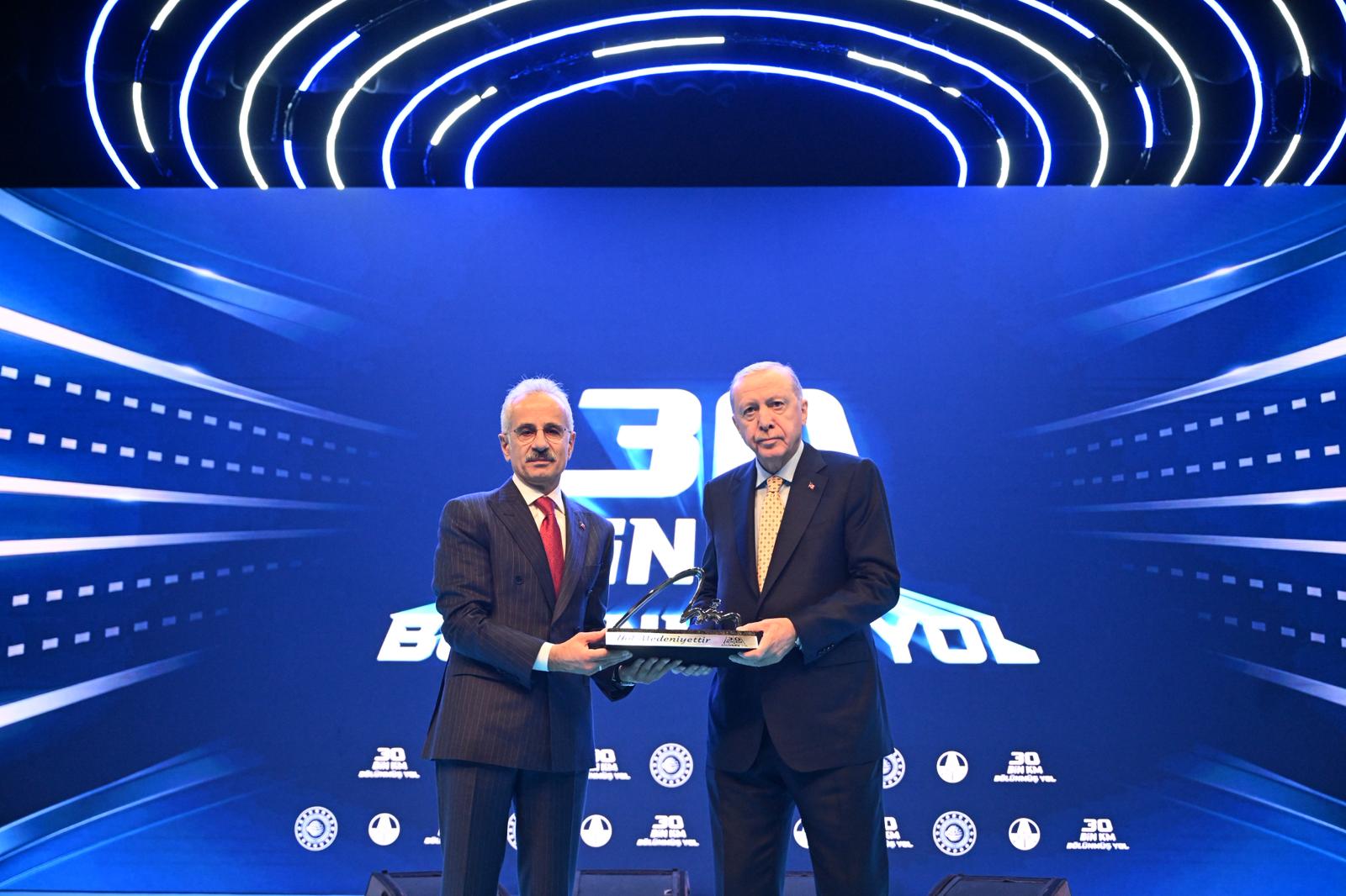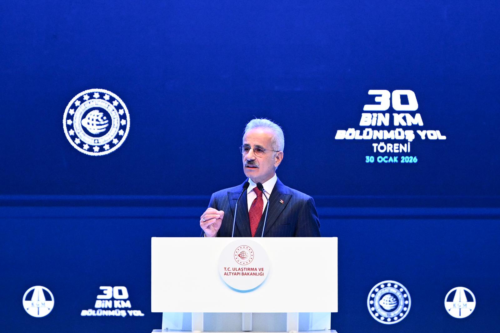 Cumhurbaşkanı Erdoğan’ın “yol medeniyettir” vizyonu ve talimatlarıyla, karayolu ulaşımında 2002'den itibaren bölünmüş yol seferberliğini başlattıklarını vurgulayan Bakan Uraloğlu, “Doğu-Batı, Kuzey-Güney demeden ülkemizi yüksek standartlı yollarla donattık. 2002'de 6 bin 101 kilometre olan bölünmüş yol ağımızı bugün 30 bin kilometreye çıkardık. Sadece 6 il bölünmüş yollarla bağlıyken, şimdi 77 ili birbirine bağladık. Otoyol uzunluğumuzu 1.714 kilometreden 3 bin 796 kilometreye yükselttik. Köprü ve viyadük uzunluğumuzu 311 kilometreden 819 kilometreye, tünel uzunluğumuzu 50 kilometreden 847 kilometreye çıkardık. Sadece geçen sene 57 km tünel yaptık. Bu köprü ve tünelleri uç uca eklesek, İstanbul'dan Iğdır'a uzanan bir mesafeden bahsediyoruz.” ifadelerini kullandı.