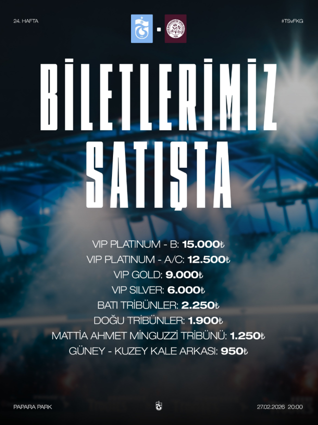 Trabzonspor’un, Trendyol Süper Lig Mehmet Ali Yılmaz Sezonu’nun 24. haftasında Mısırlıcom Fatih Karagümrük ile oynayacağı maçın biletleri satışa çıktı.