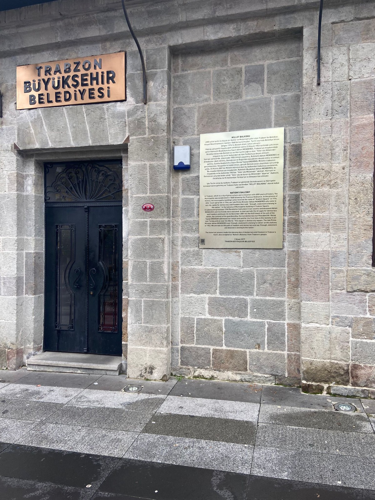 Cumhurbaşkanımız Sayın Recep Tayyip ERDOĞAN, Milletin iradesinin gerçekleşmesi, Vesayetlerin kaldırılması, gerçek Demokrasiye ulaşılması için çıktığı yolda, 24 Kasım 2001’de Milletin kürsüsü olan bu balkondan halkımıza seslenerek “Bu meydan Demokrasi meydanıdır, Rahmetli Başbakan Adnan MENDERES, bu meydanda ve bu balkonda 1953’de “Yeter söz Milletindir” demişti. Hürriyet ve Demokrasi yolunda bizde şimdi Yeter söz de karar da Milletindir” diyoruz” ifadesini, ilk defa bu tarihi balkondan Türkiye’ye ve Dünyaya ilan etmiştir. İşte Tarihi süreç bu balkonu Trabzon’un gönlünde Demokrasinin ve Hürriyetin kürsüsü haline getirmiş ve Trabzon halkı tarafından “MİLLET BALKONU” olarak kabul edilmiştir.”