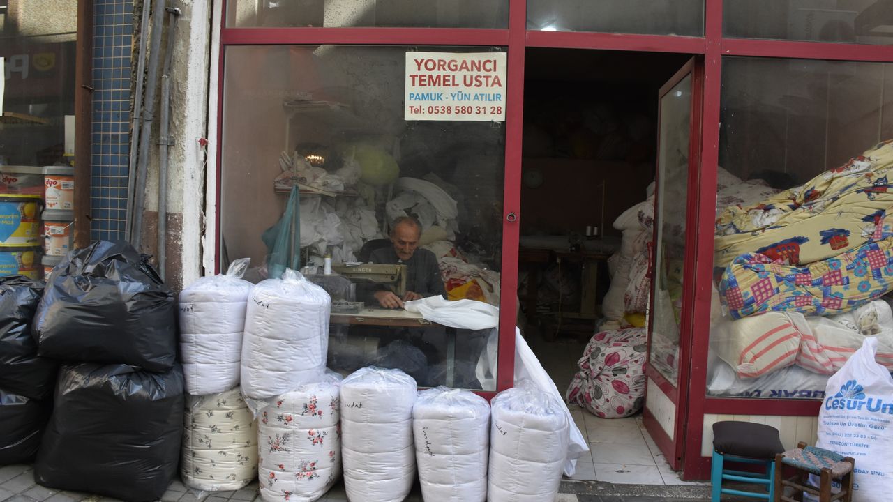 Trabzon'un Ortahisar ilçesinde yarım asrı aşkın süredir yorgancılık yapan 77 yaşındaki Temel Çoğalmış, bitme noktasına gelen mesleğini ayakta tutmaya çalışıyor.