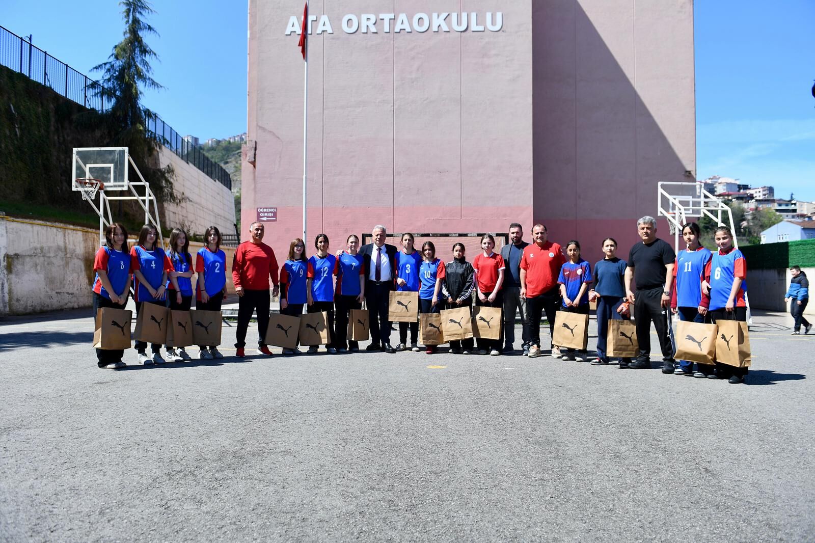 Hediye töreninde konuşan Başkan Yardımcısı Cüneyit Zorlu, “Belediye Başkanımız Ahmet Kaya’nın da mezunu olduğu Ata Ortaokulumuz, futsaldaki başarısıyla bizleri gururlandırıyor. 16 Trabzon şampiyonluğu ve 7 bölge yarı finali başarısı bulunan Küçük Kızlar Futsal Takımımız bu yıl da bölge şampiyonasına katılacak.