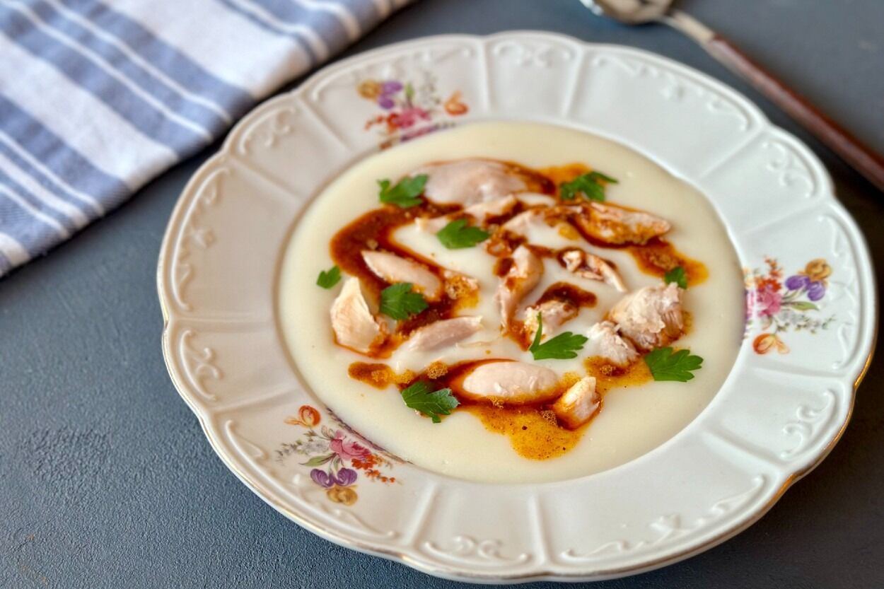 Soğuyan tavuk butlarının etlerini kemiklerinden ayırın ve didikleyin. Servis tabağına ya da geniş bir servis kasesine önce hazırladığınız yoğun çorbayı alın. Üzerine didiklediğiniz tavuk etlerini yerleştirin.