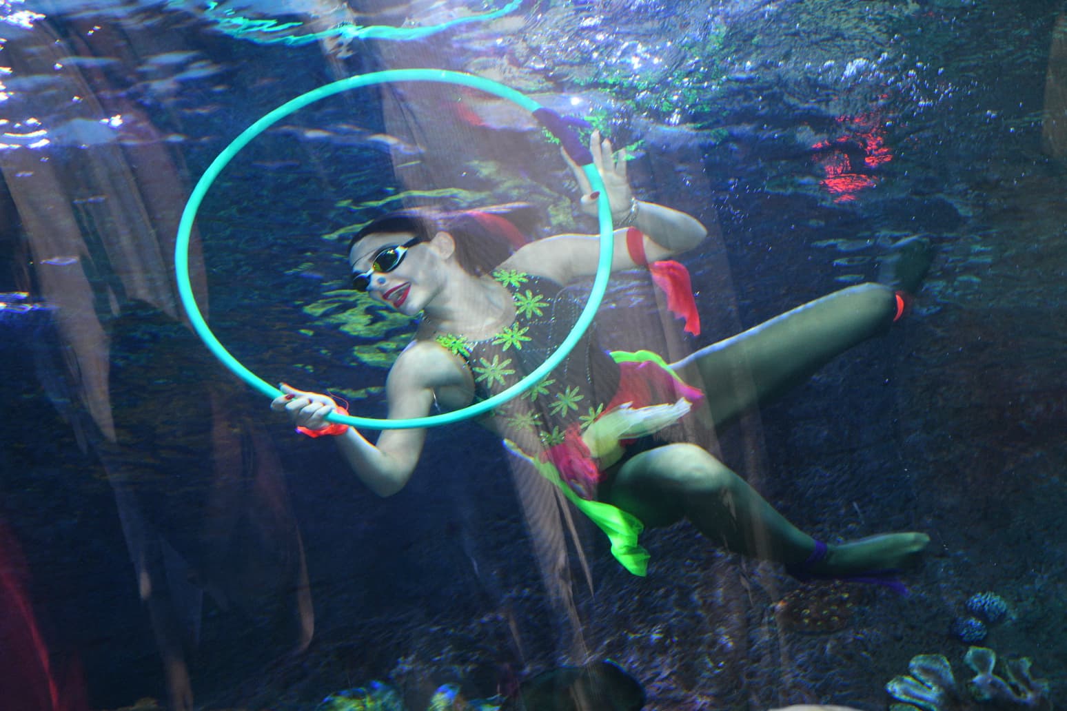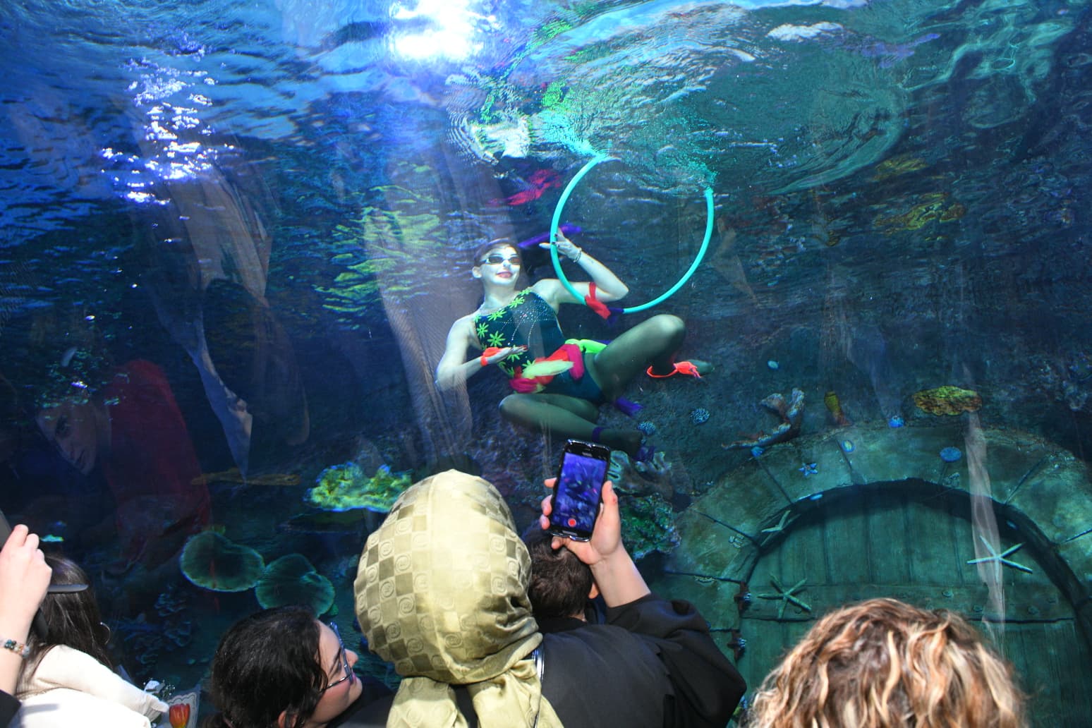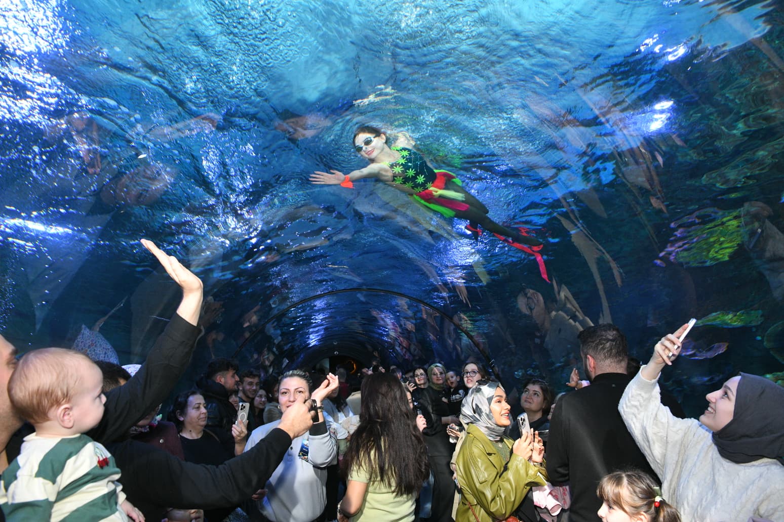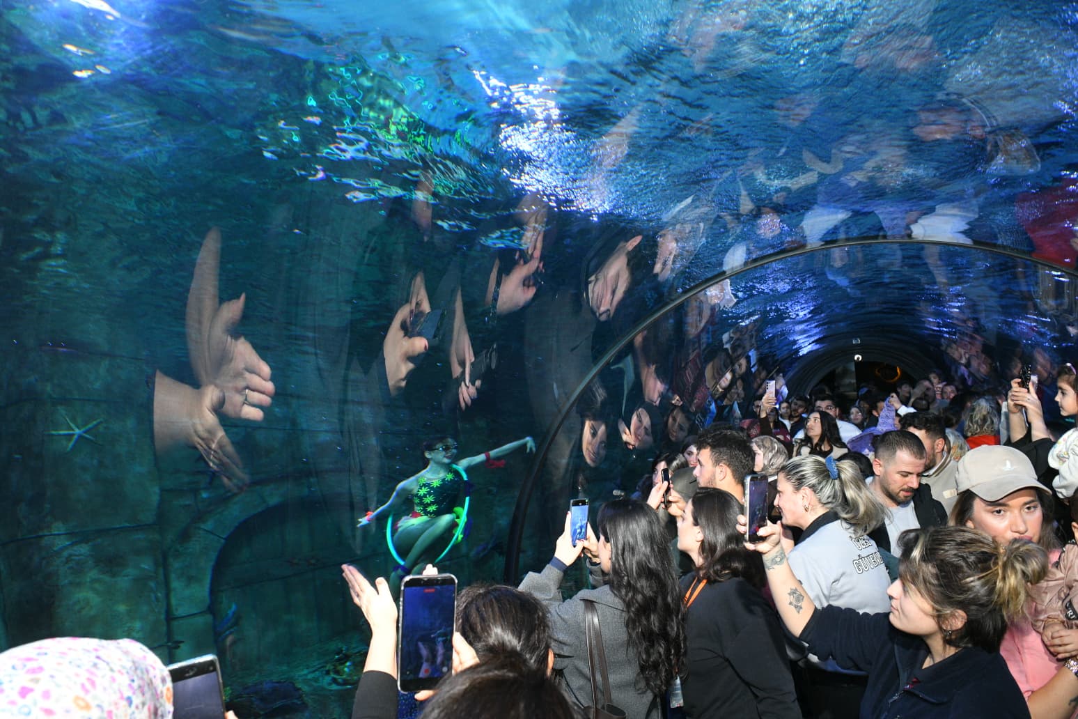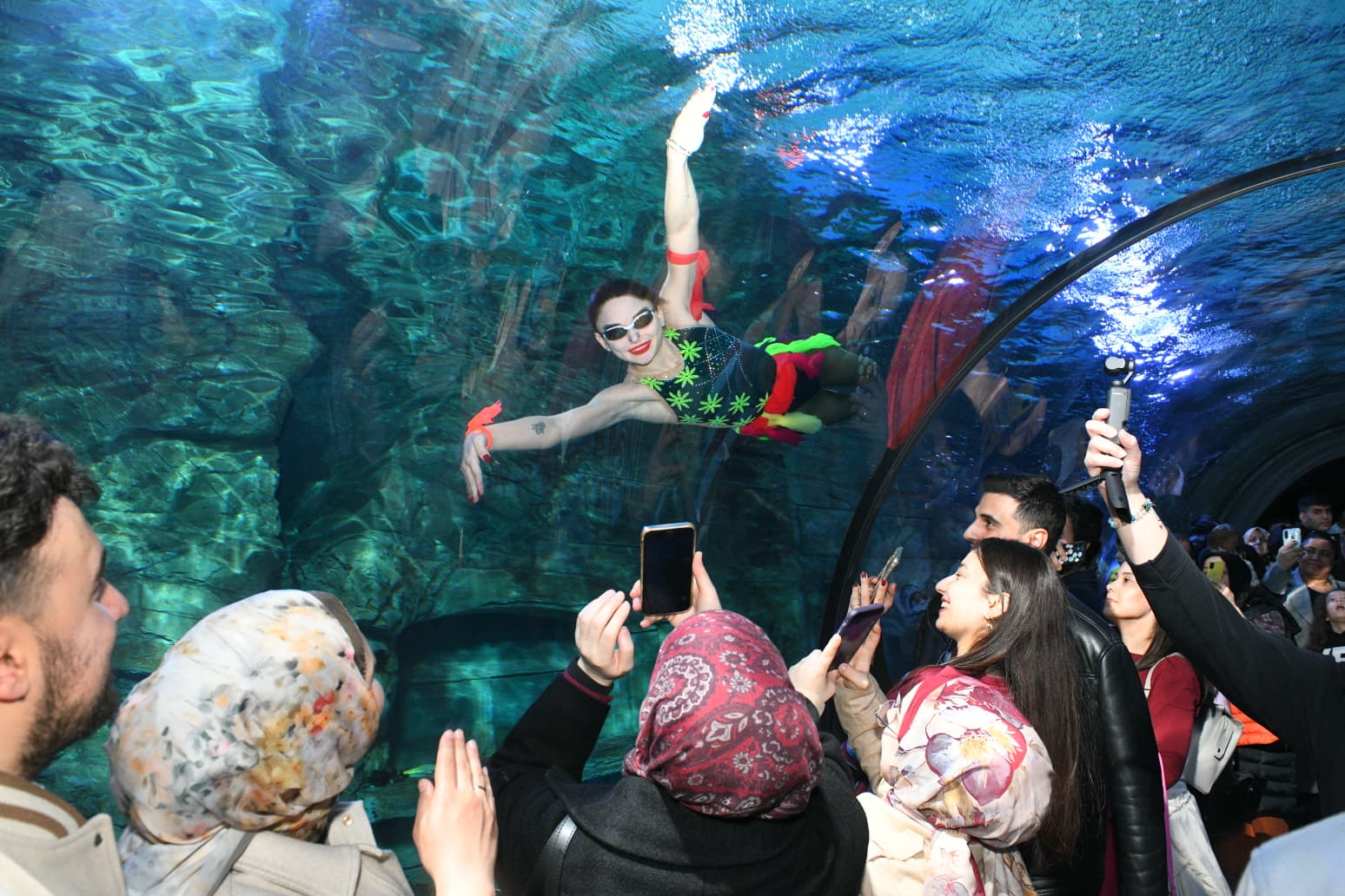 Tüpsüz şekilde balıklarla dolu akvaryuma giren sporcu, 10 dakika boyunca etkileyici bir performans sergiledi. Halkanın içinden geçme, sıçrama, ters dönme gibi su balesi tekniklerini sergileyen Deniz Kızı’nın performansına alkışlarla eşlik eden ziyaretçiler, büyüleyici gösteriyi telefonlarla görüntüleyerek kayıt altına aldı.