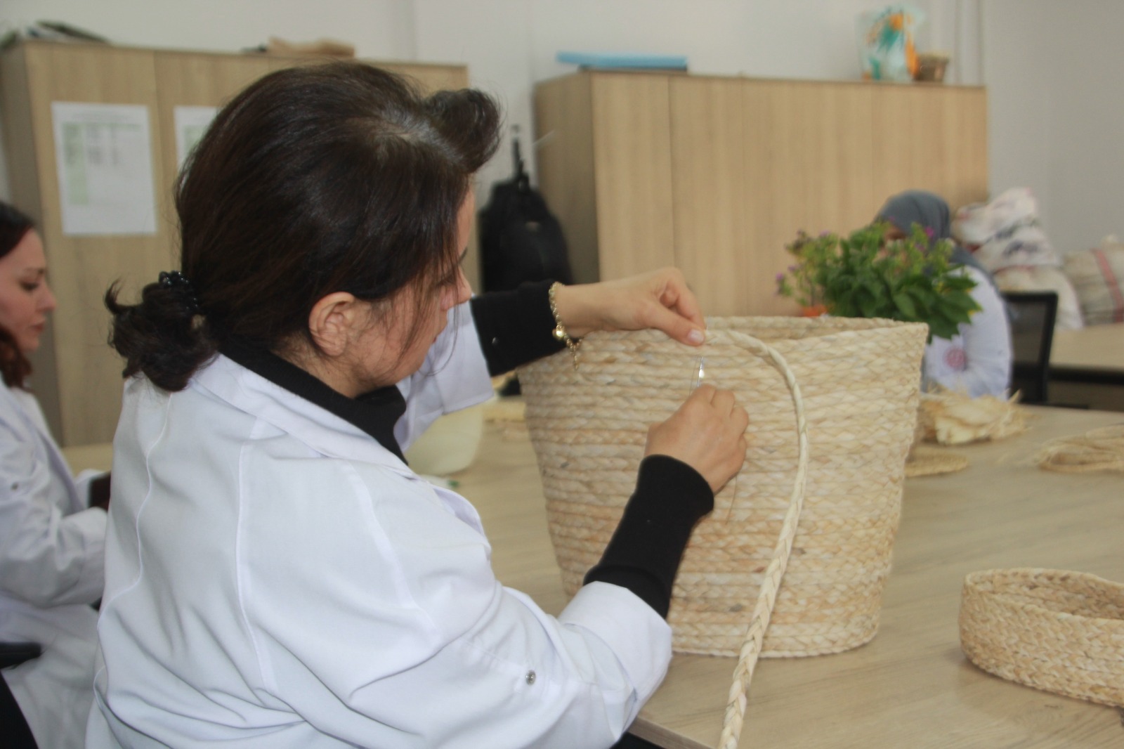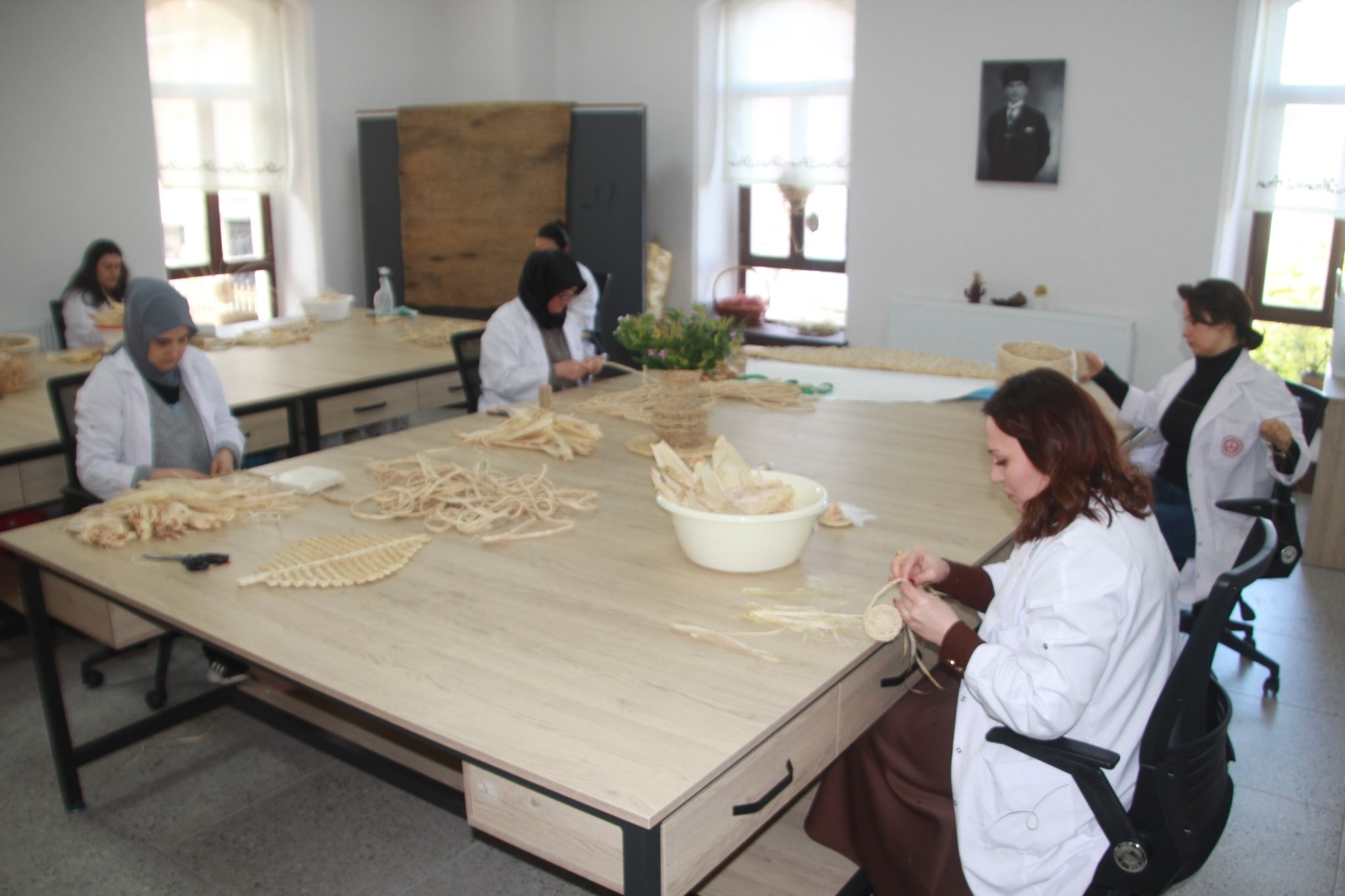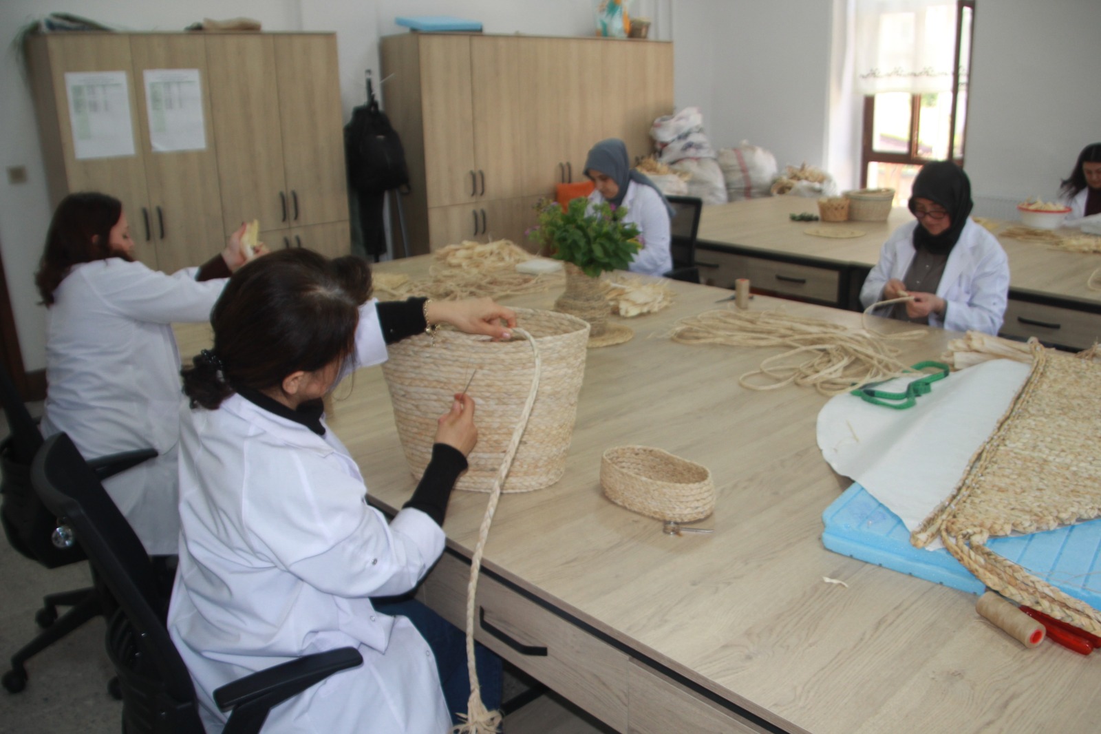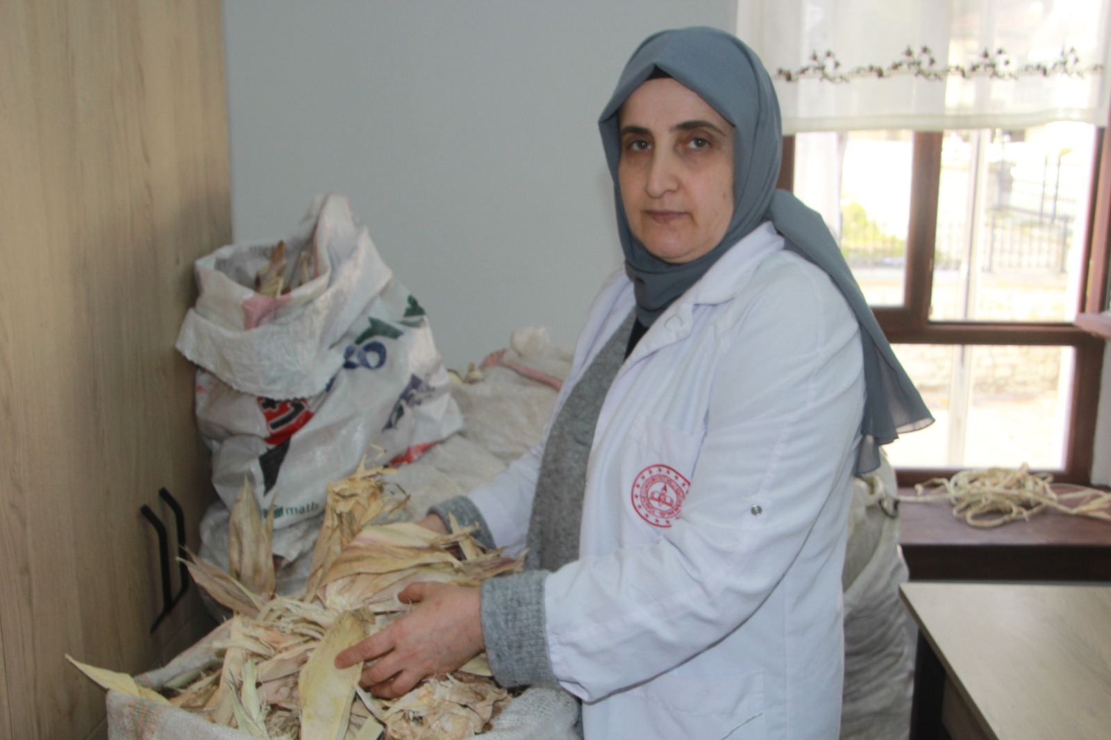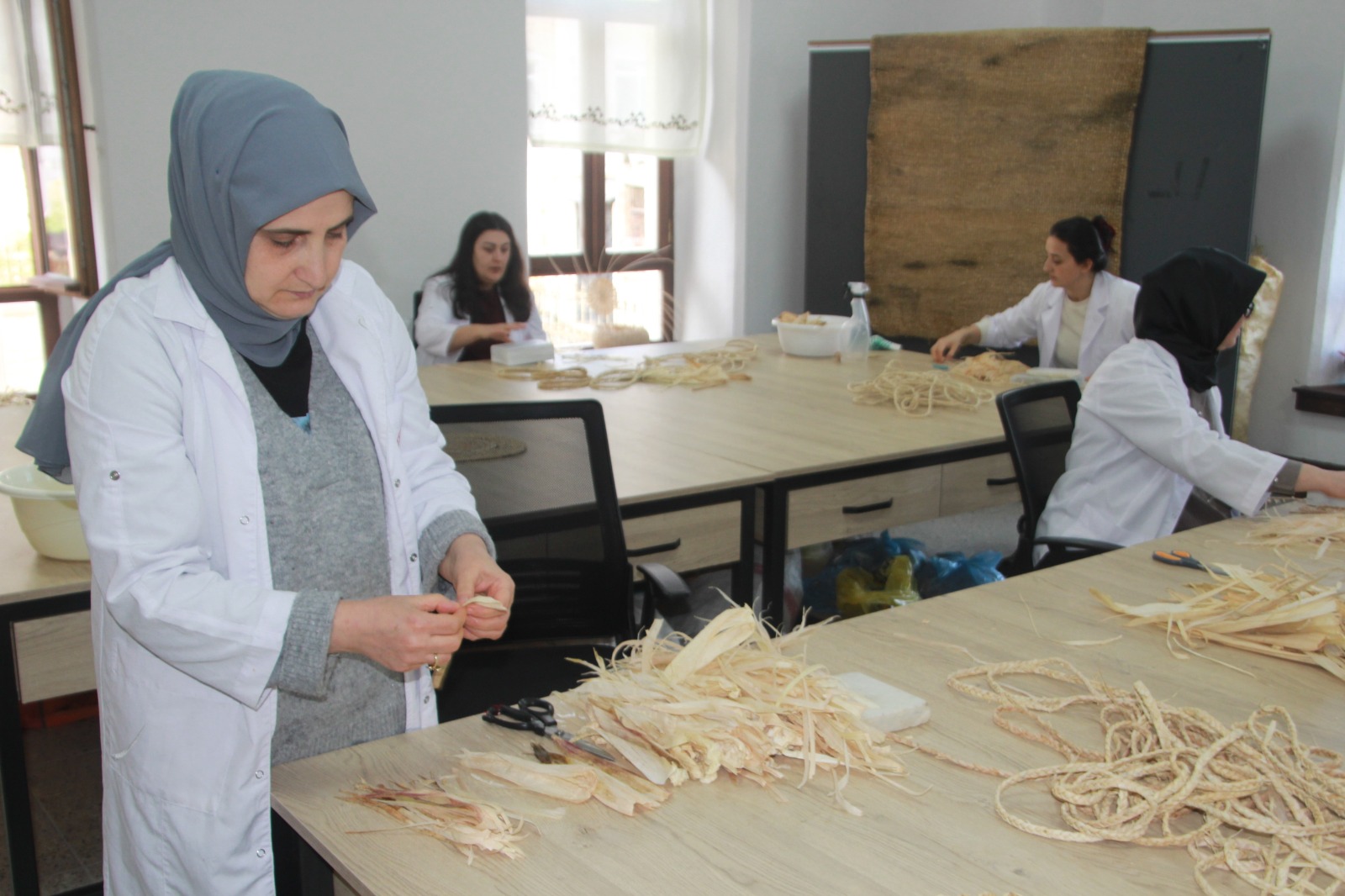 Hayvan yemi dışında pek kullanılmayan bu doğal malzeme, bölgedeki üreticilerden toplanarak, kurum bünyesinde zahmetli bir sürecin ardından değerlendirmeye alınıyor. Kurutma, ayıklama ve ıslatma işlemlerinden geçirilen mısır kabukları, ince şeritler haline getirilip doğal ip formuna kavuşturuluyor. Bu ipler, usta ellerde ev ve yaşam alanlarına değer katan fonksiyonel ürünlere dönüşüyor.