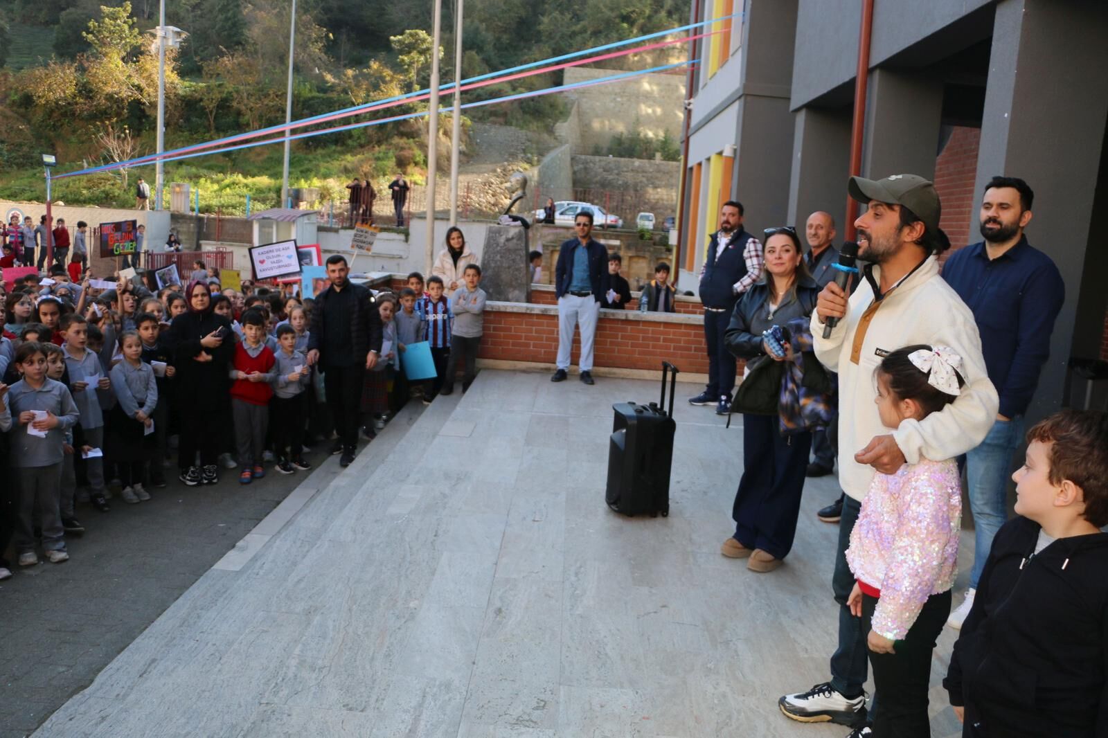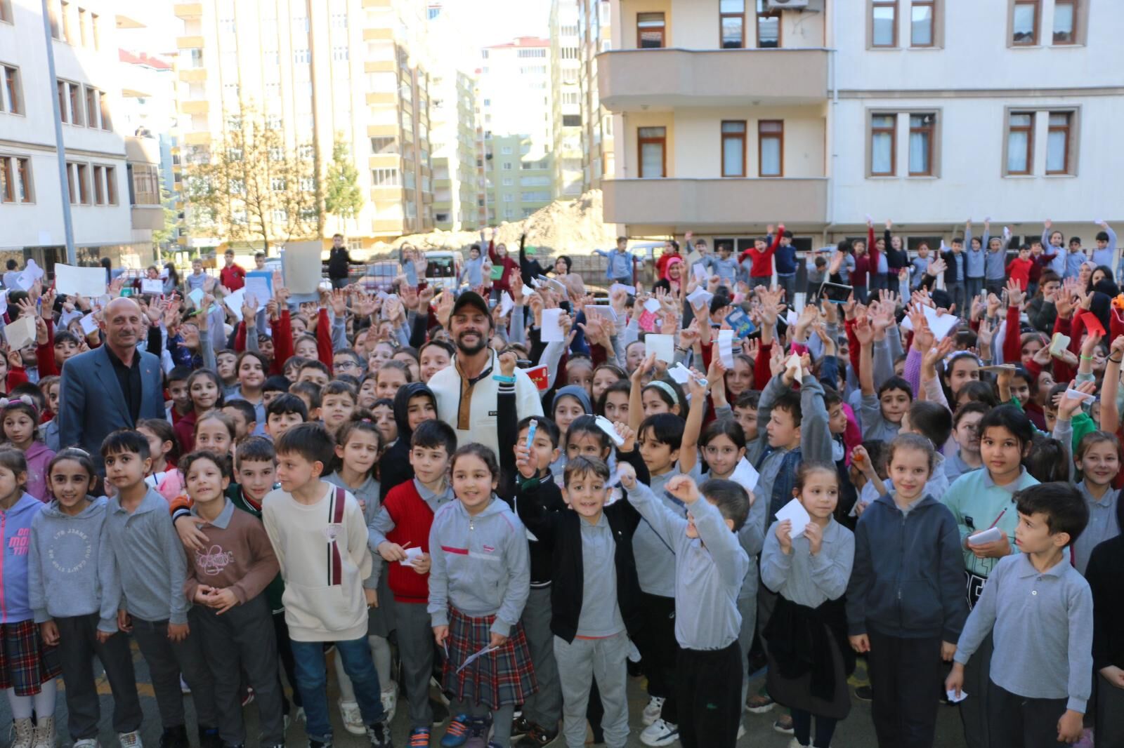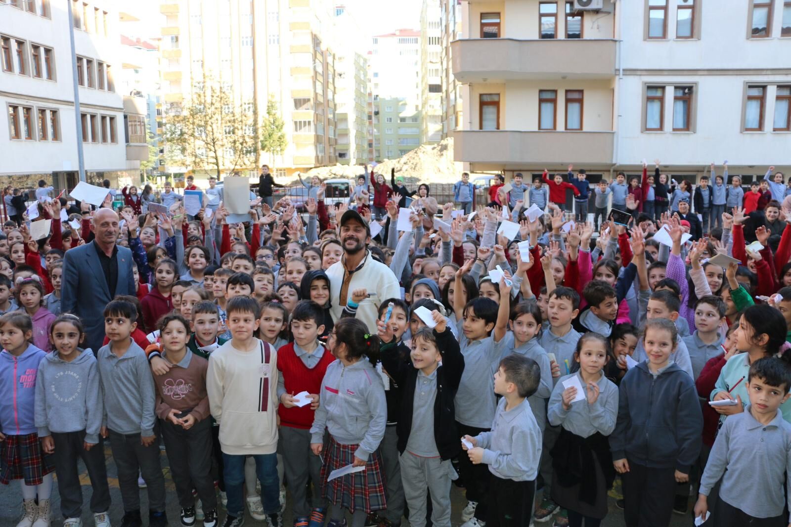 Oyuncu Dilber sınıf ziyaretinin ardından okulun bahçesinde toplanan öğrencilerle buluştu.