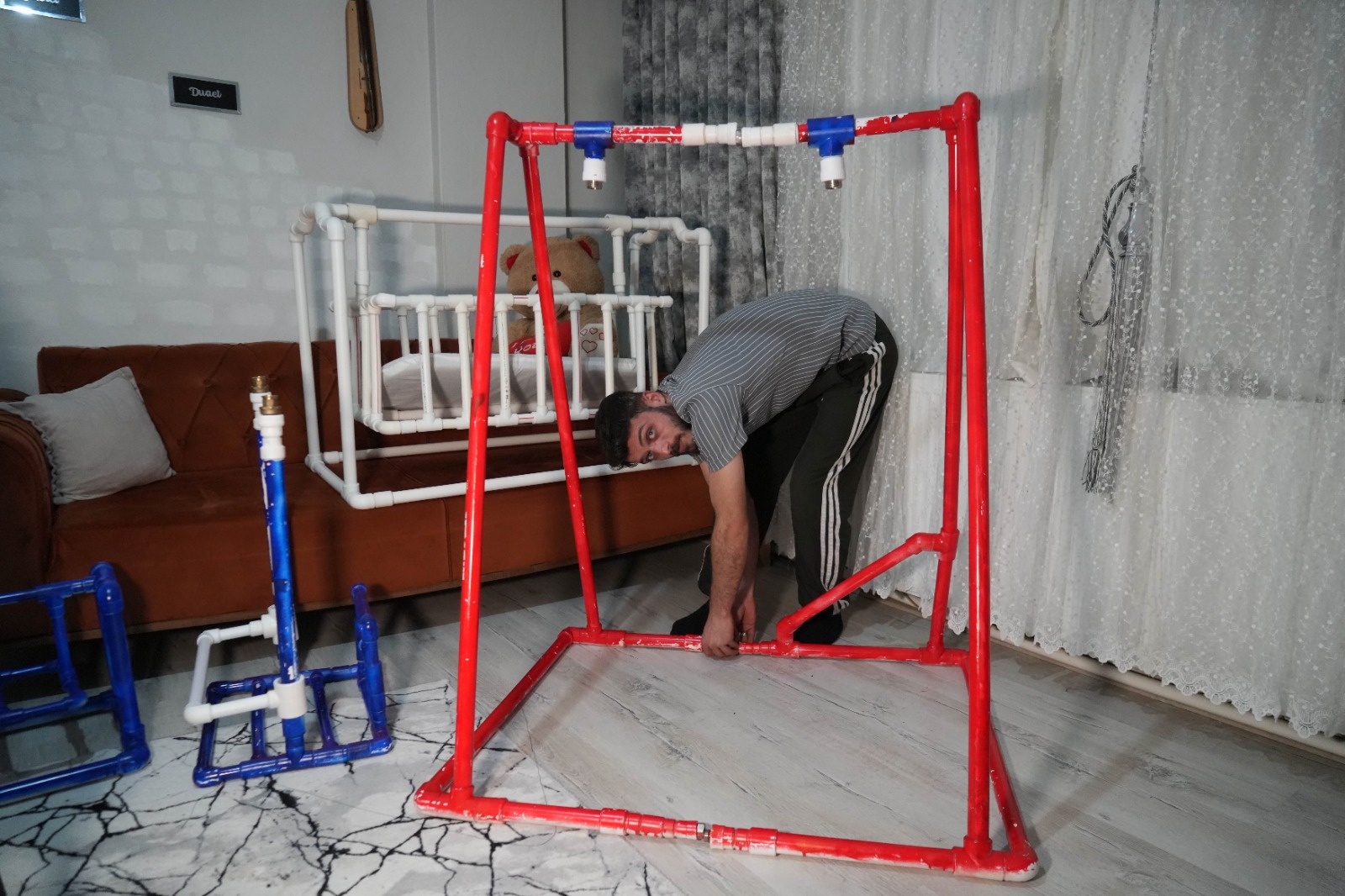 Beşiğin gördüğü yoğun ilginin ardından üretmeye devam eden Furkan Karadağ, bu kez su borularından sökülüp takılabilen bir çocuk salıncağı yaptı. Tıpkı beşikte olduğu gibi salıncağın sağlamlığını da bizzat üzerine çıkarak test eden Karadağ, bu anları da sosyal medya hesaplarında paylaştı.