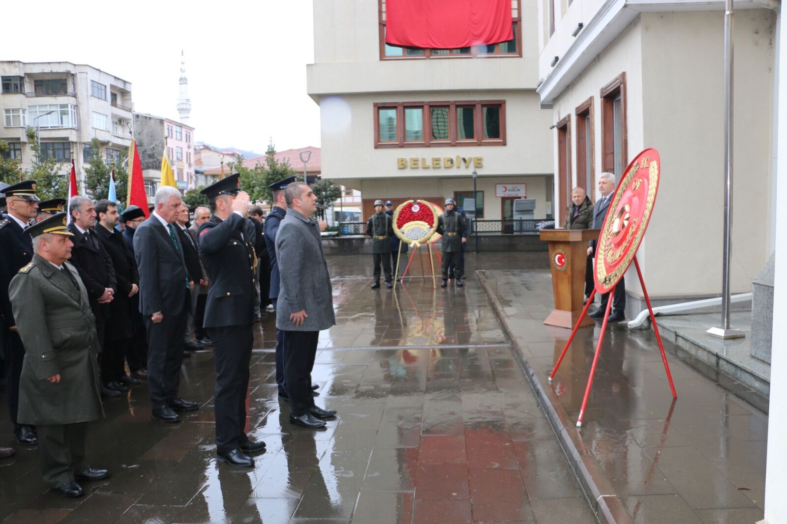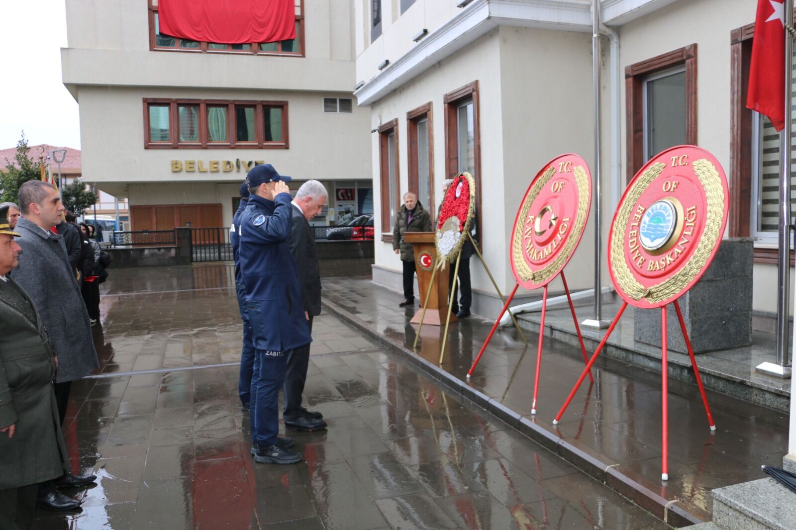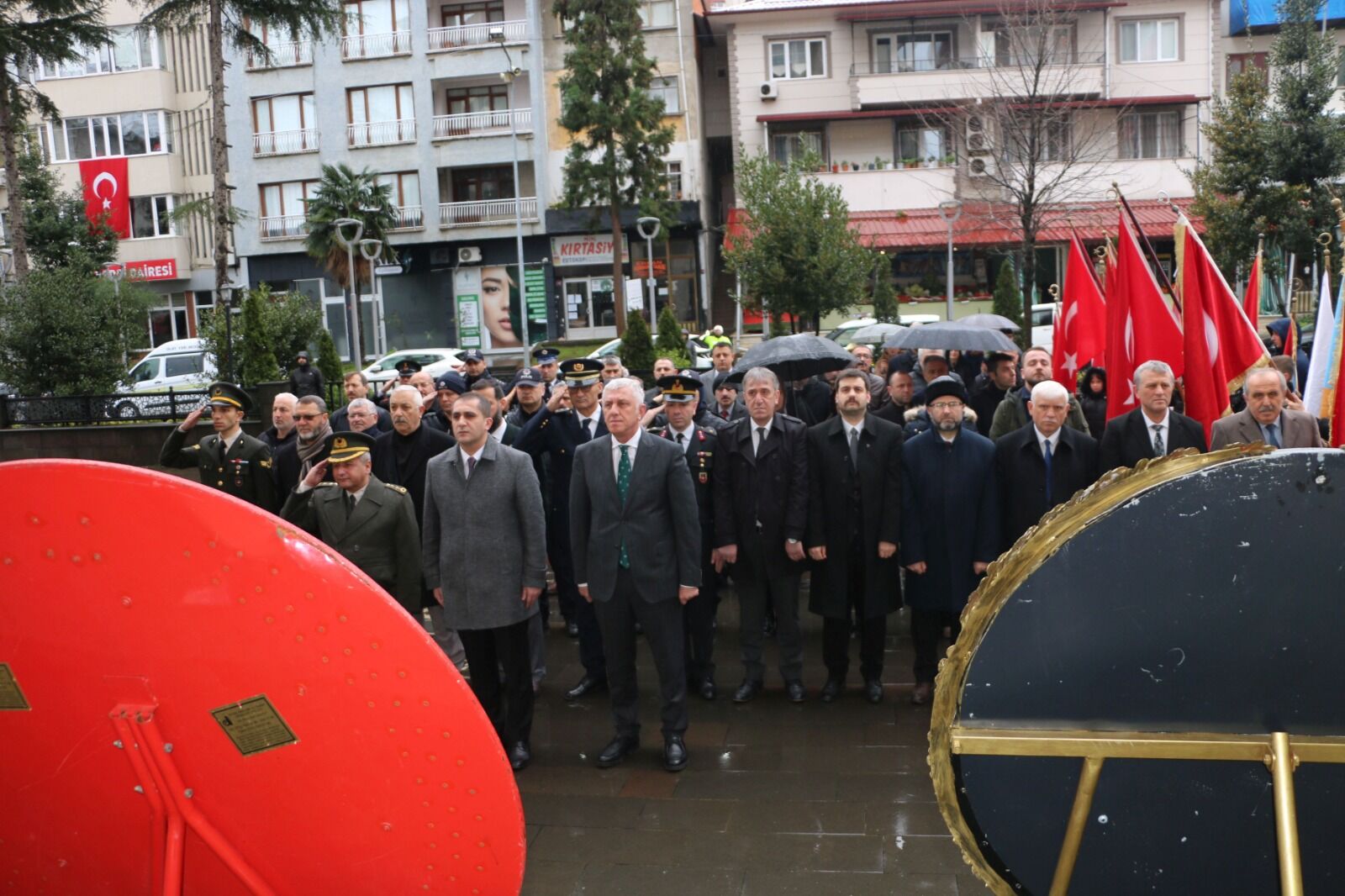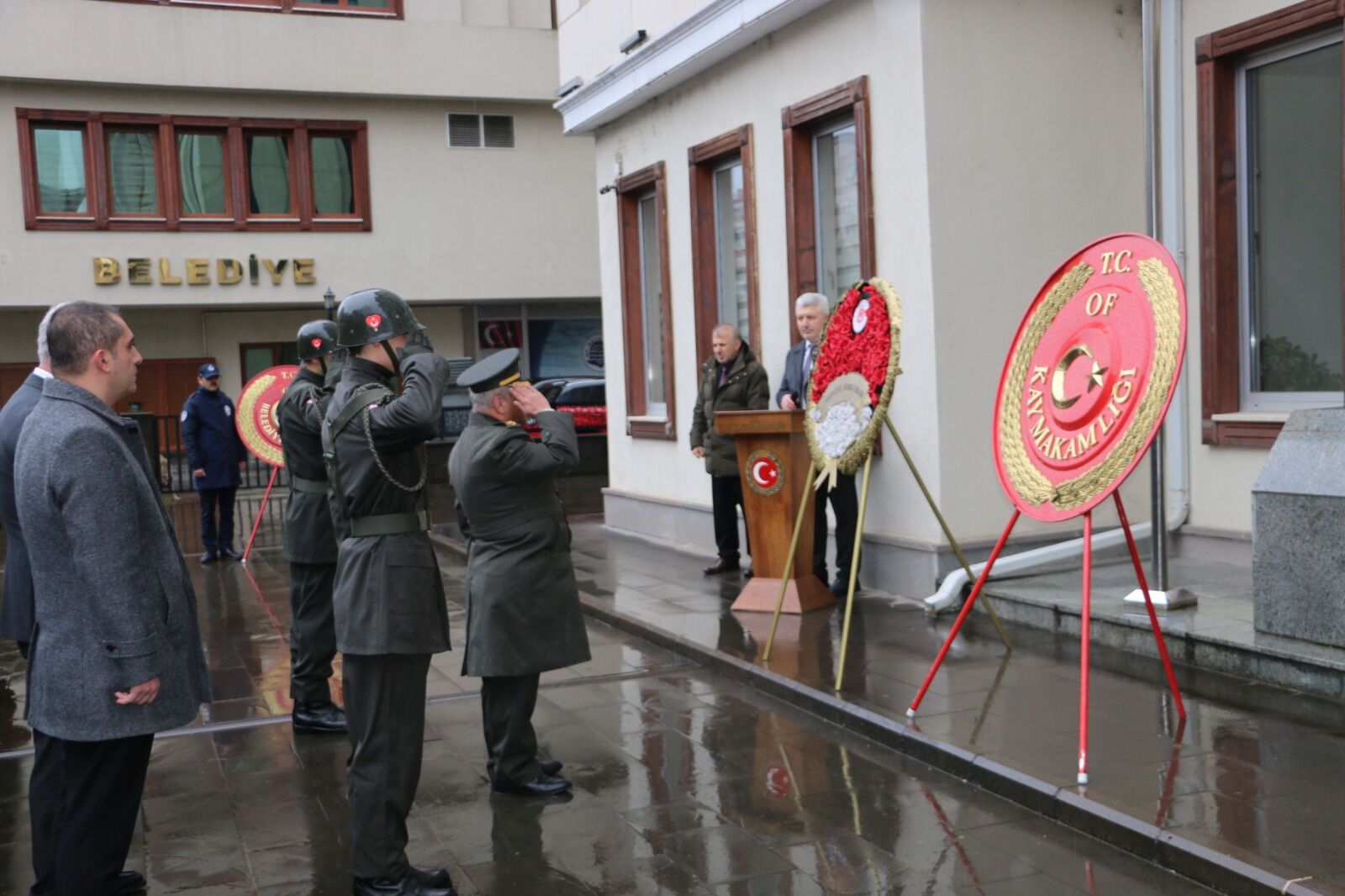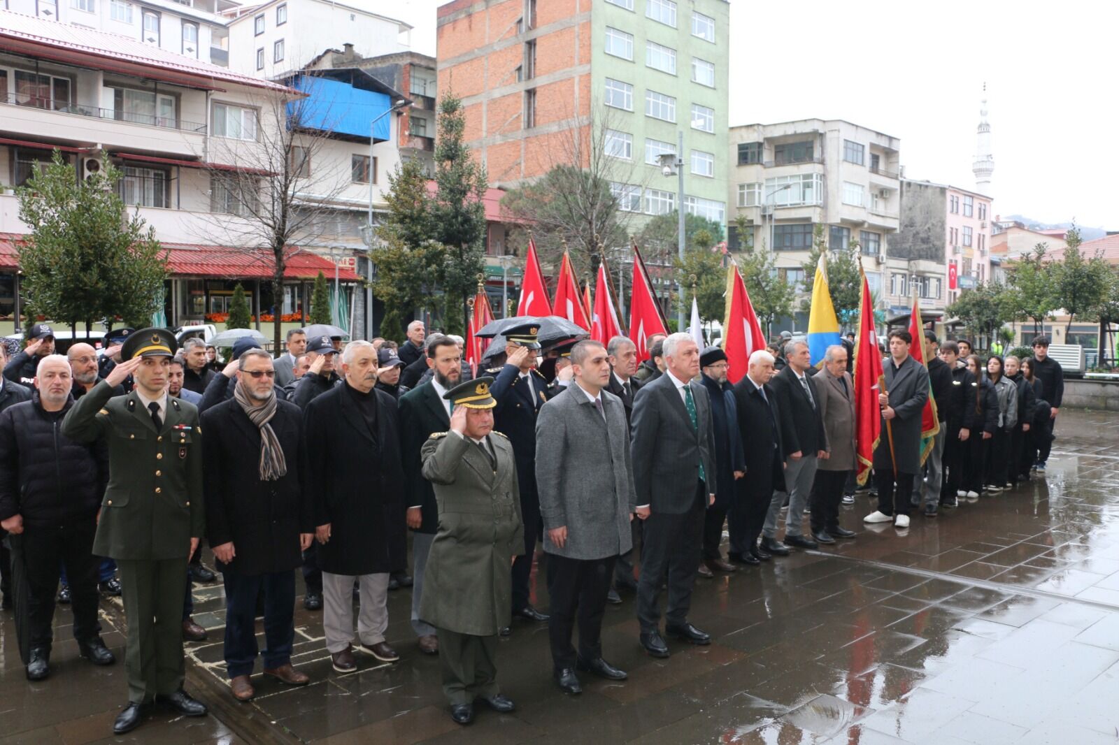 Kutlama programı, Of Kaymakamlığı önündeki Atatürk büstüne çelenk sunulmasıyla başladı. Of Kaymakamlığı, Garnizon Komutanlığı ve Belediye Başkanlığı tarafından çelenklerin sunulmasının ardından saygı duruşunda bulunuldu ve İstiklal Marşı okundu.
