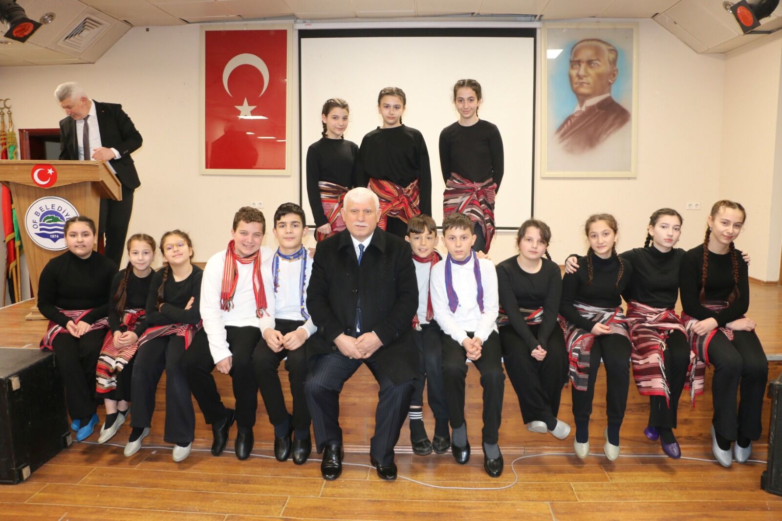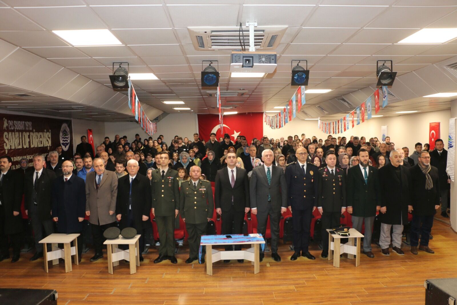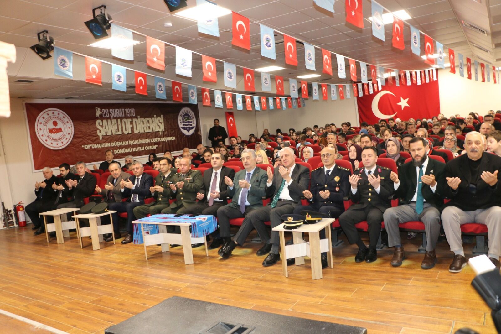 Anıt önündeki törenin ardından resmi kutlama programı Of Belediyesi Konferans Salonu’nda devam etti. Buradaki program da saygı duruşu ve İstiklal Marşı ile başladı.
