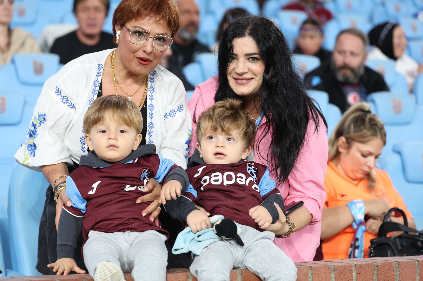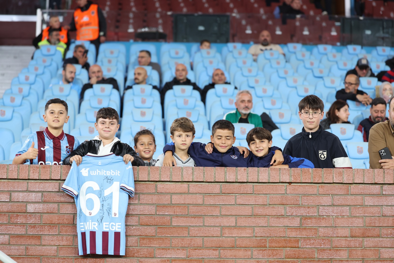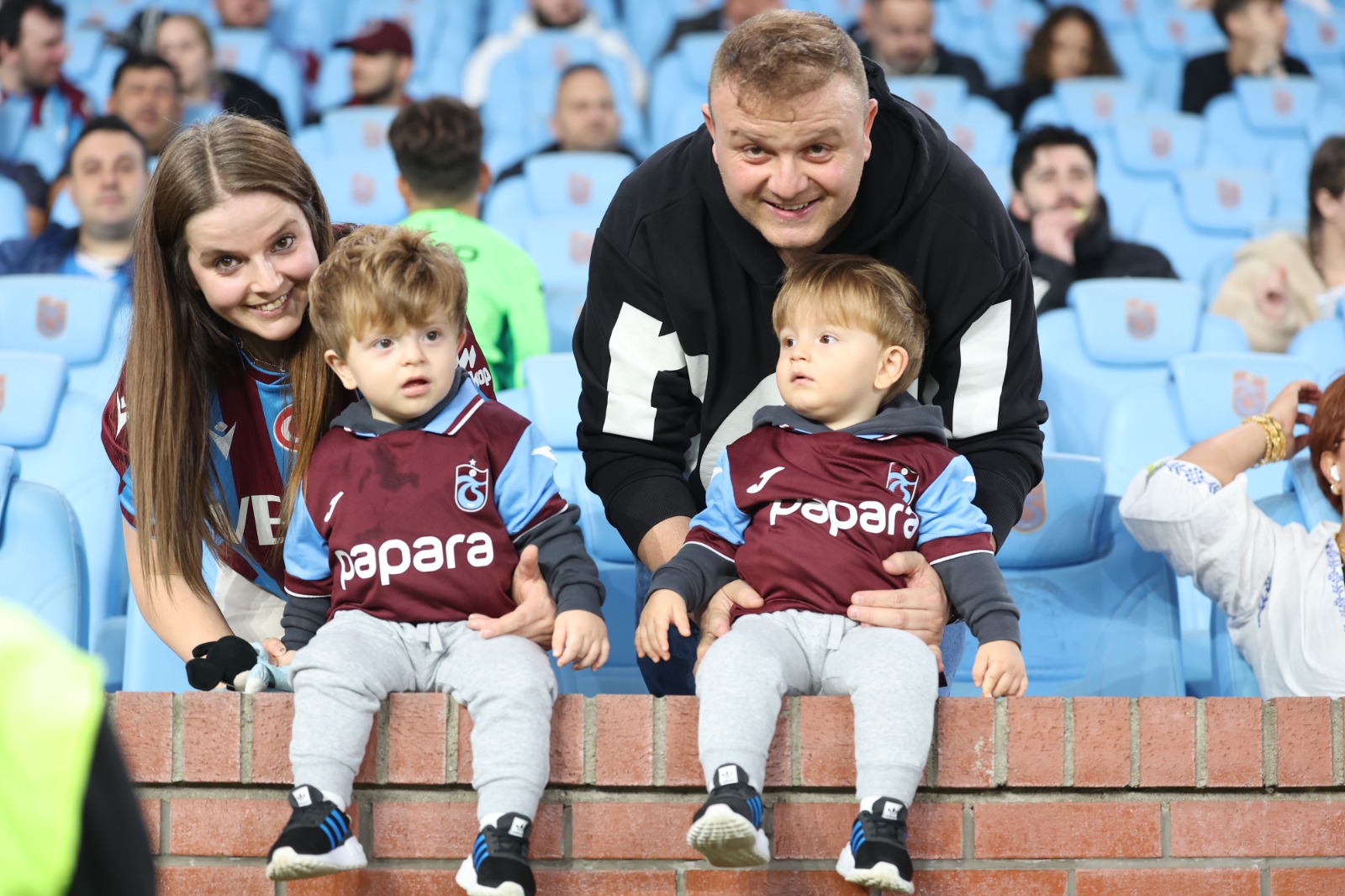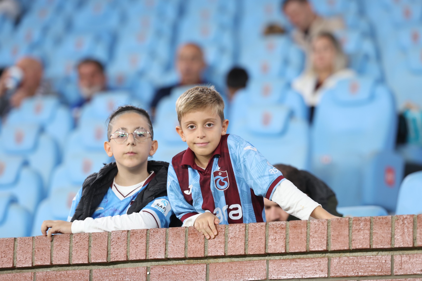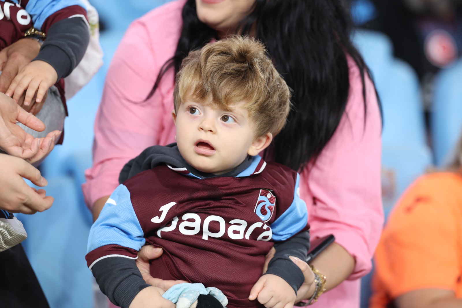 Bordo-mavili formalarıyla tribünleri dolduran minik taraftarlar, aileleriyle birlikte takımlarına destek verirken renkli görüntüler oluşturdu.