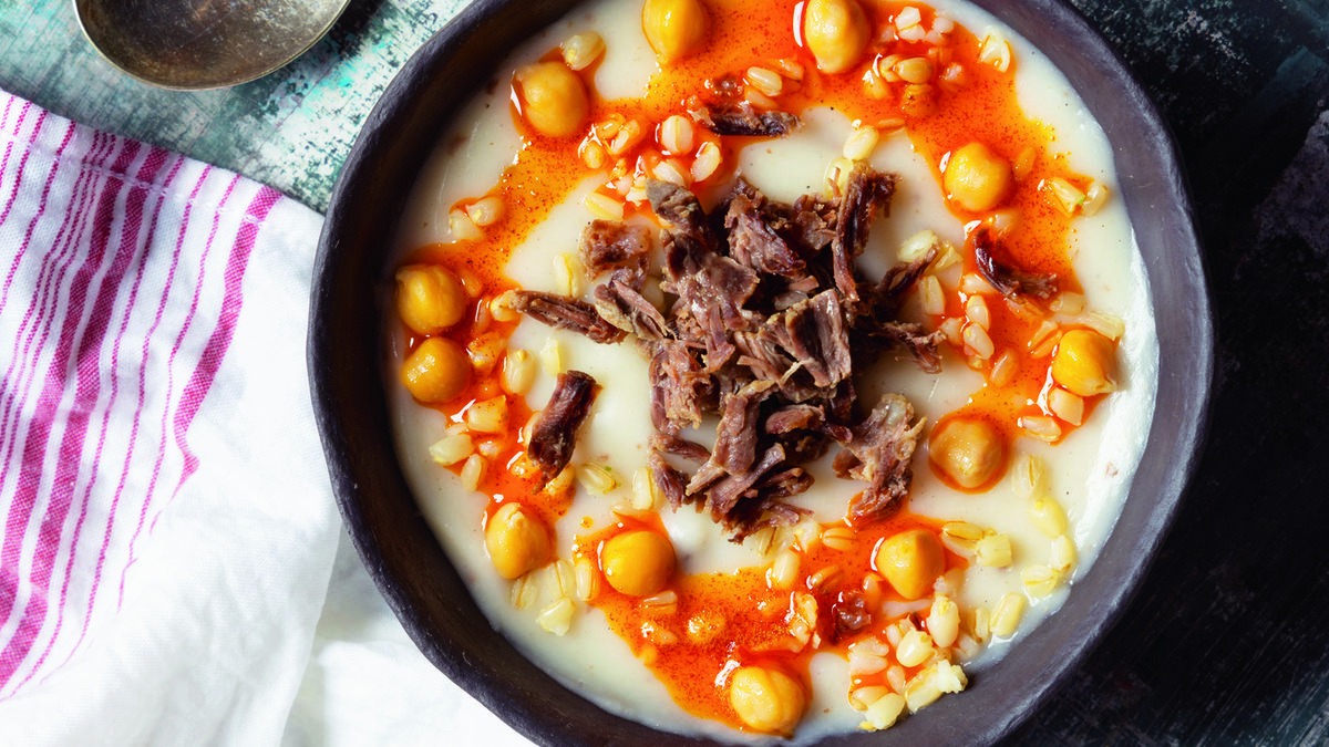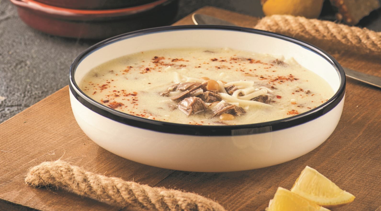 Kemikli etleri haşlayıp etleri kemikten ayırın. Et suyu ve suyu tencereye alıp kaynatın. Terbiye malzemelerini ayrı bir kapta çırpın. Kaynar sudan azar azar ekleyerek ılıştırın. Karışımı yavaş yavaş çorbaya ilave edin ve sürekli karıştırın. Kaynamaya başlayınca doğranmış etleri ekleyin. 4-5 dakika daha pişirin. Ayrı bir tavada yağ ve sarımsağı kavurup kırmızı biber ekleyin, çorbaya ilave edin. Sıcak servis edin.
