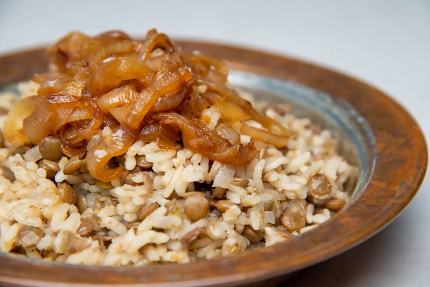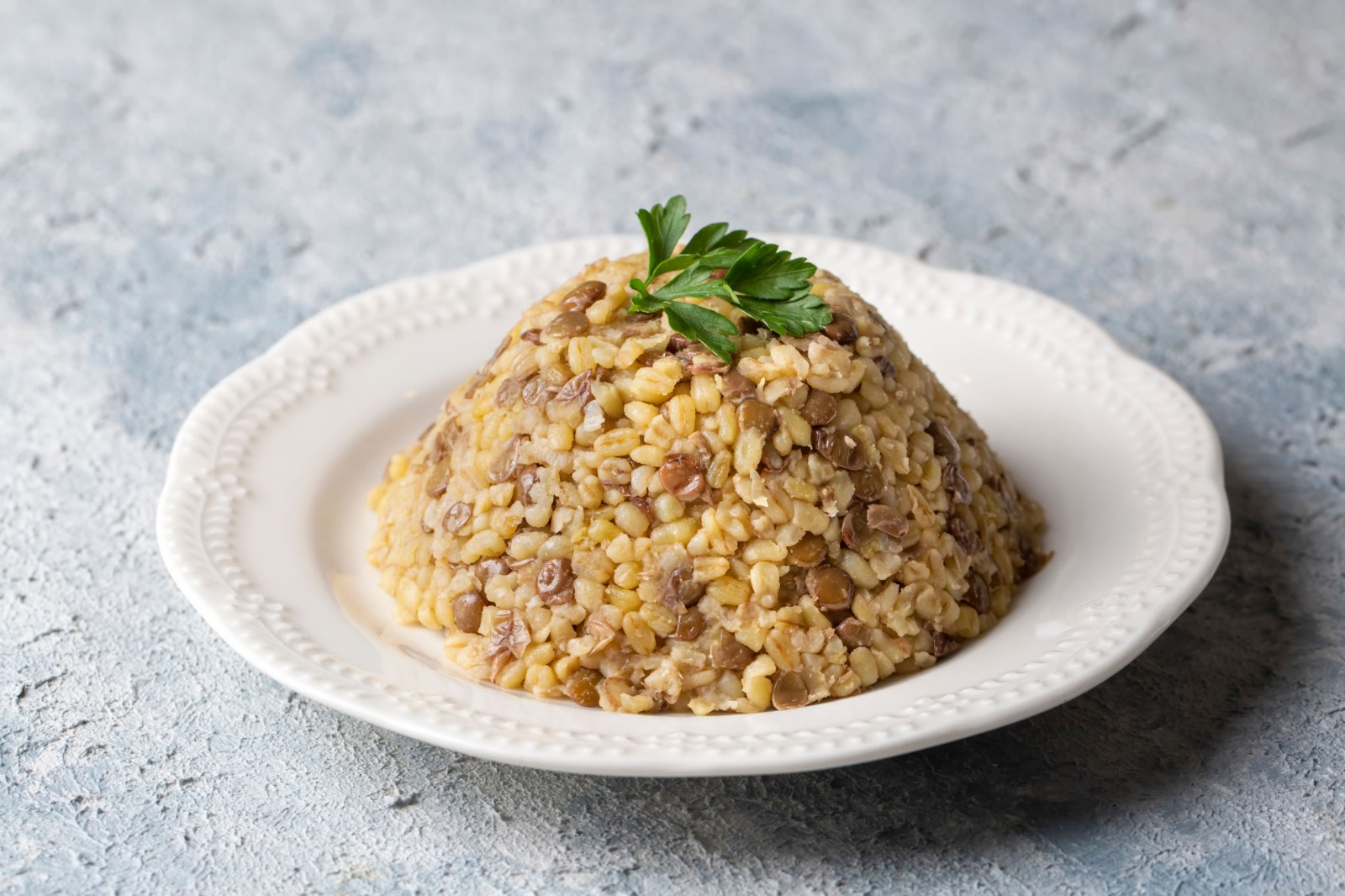 Mercimeği haşlayıp süzün. Soğanları halka doğrayıp zeytinyağında kavurun. Salçayı ekleyip kavurmaya devam edin. Su ve baharatları ilave edip kaynatın. Bulguru ekleyin, birkaç dakika sonra haşlanmış mercimeği katın. Kısık ateşte suyunu çekene kadar pişirin. 10 dakika dinlendirip karıştırarak servis edin.