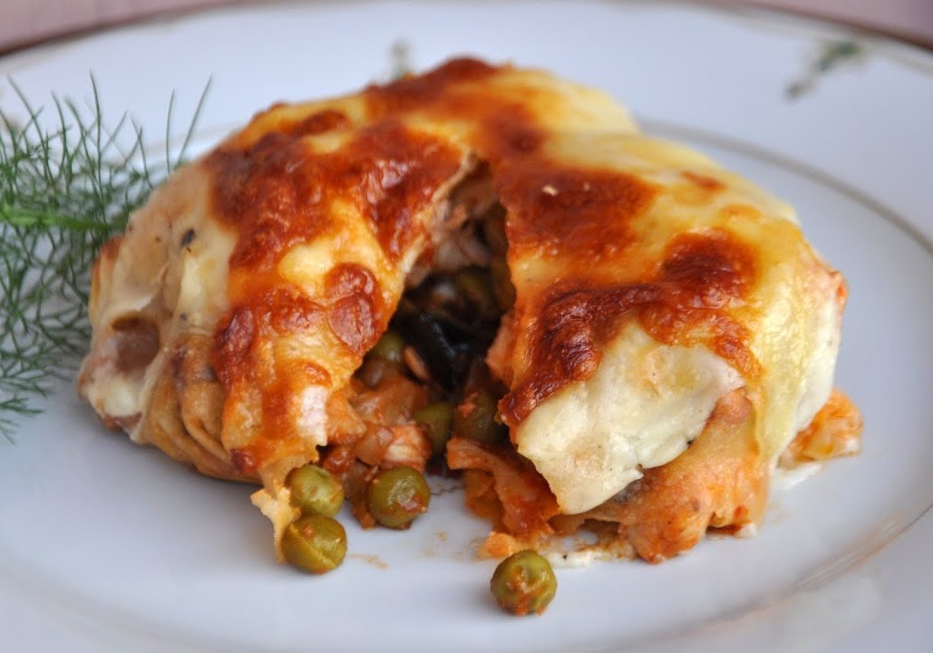 Eti haşlayın. Soğanı kavurun, havuç ve patatesi ekleyin. Salça ve baharatları ilave edin. Eti ve bezelyeyi ekleyip biraz et suyu ilavesiyle pişirin. Beşamel sosu hazırlayın. Yufkaları bölüp kaselere yerleştirin, iç harcı koyup kapatın. Tepsiye ters çevirin. Üzerine beşamel ve kaşar ekleyin. 180 derecede kızarana kadar pişirin.