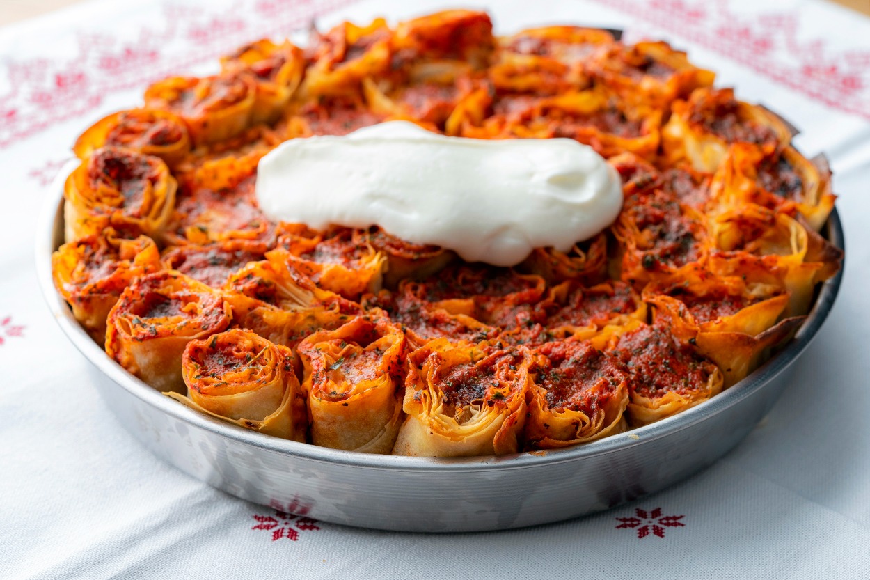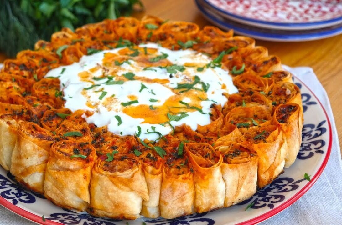 Kıymayı kavurun. Soğan ve yağı ekleyin. Salça ve biraz su ilave edip pişirin. Yufkayı serip yağlayın ve rulo yapın. İki parmak kalınlığında kesin. 180 derecede 15 dakika pişirin. Üzerine sarımsaklı yoğurt ve kıymalı sos dökerek servis edin.
