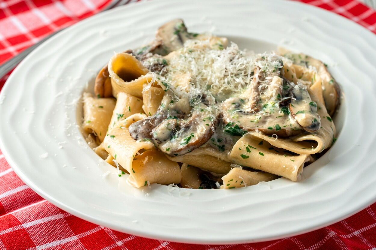 Kremayı ya da sütü tavaya ilave edin. Hızlıca karıştırarak sosu açın. Ardından mantarlarla birleştirin. Bir taşım kaynatın. Sonra rendelenmiş kaşar peynirini ekleyin ve peynir tamamen eriyene kadar karıştırın.