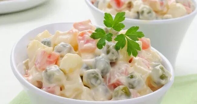 Havuç ve patatesleri küp doğrayıp haşlayın. Süzüp soğumaya bırakın. Bezelyeyi ekleyin. Ayrı bir kapta yoğurt ve mayonezi karıştırın. Sebzeleri ve doğranmış turşuyu ekleyip harmanlayın. Soğuk servis edin.