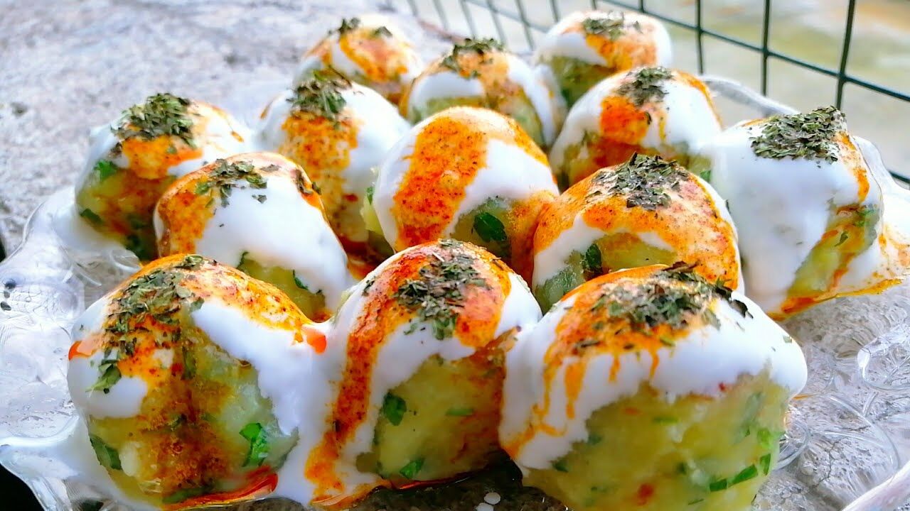 Üzeri için yoğurdu sarımsakla çırpın. Hazırladığınız sarımsaklı yoğurdu patates toplarının üstüne dökün.