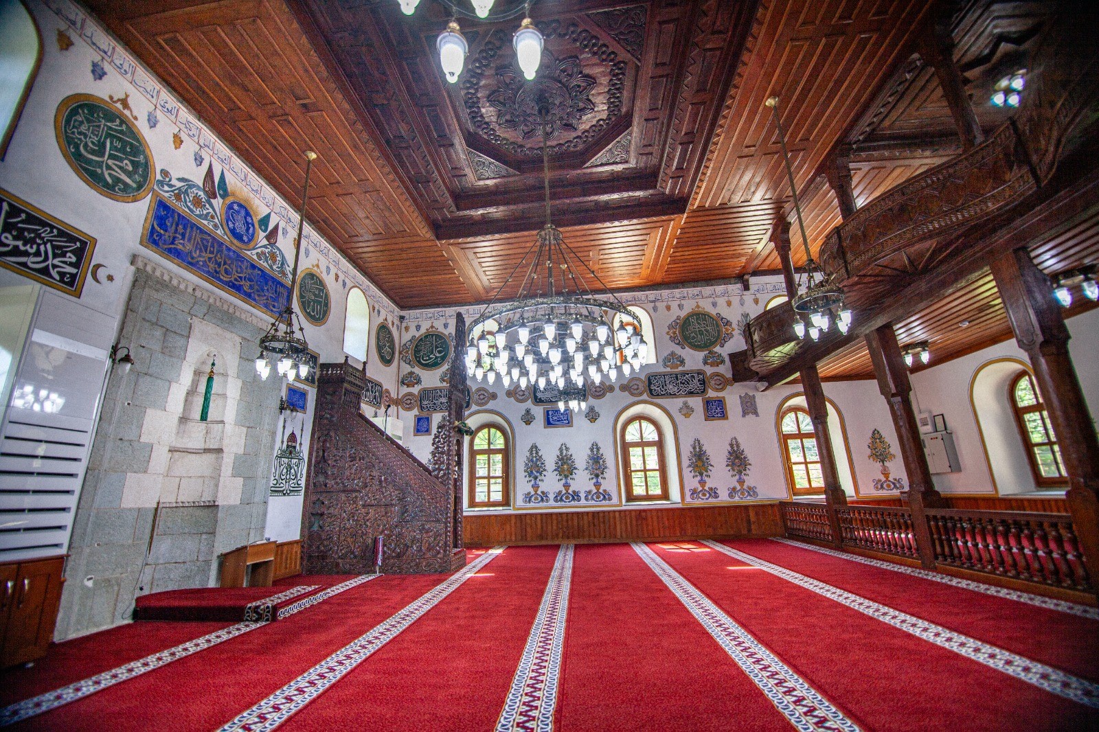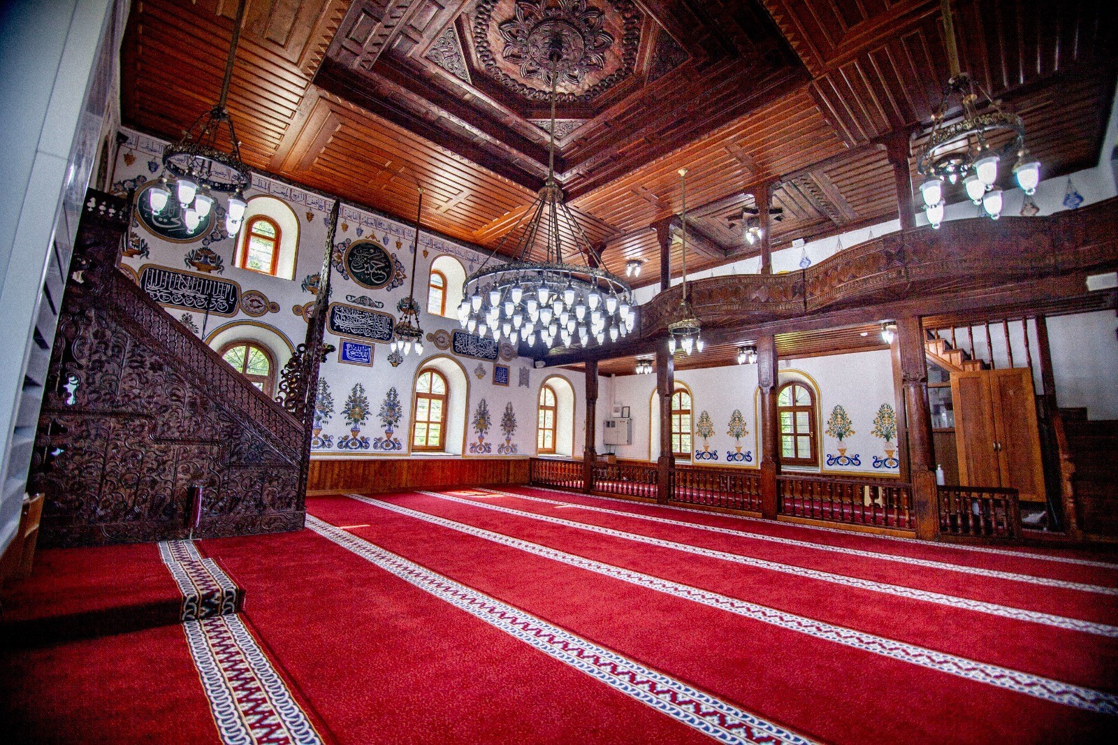 Karacakaya Mahallesi Camii’ni farklı kılan unsurlardan biri de iç mekândaki detaylarda gizli. Ahşap döşemeler ve tavan, geometrik ve bitkisel motiflerle süslenmiş mahfil korkulukları, sade taş mihrap ve ince işçilikle hazırlanmış ahşap minber, yapının sanat yönünü öne çıkarıyor. Harim duvarlarında yer alan kalemişlerinde ise ayet kartuşları, selvi ağaçları, çiçek motifleri ve cami minyatürleri dikkat çekiyor. Bu zarif süslemeler, caminin sadece bir ibadet mekânı değil; aynı zamanda bir kültürel miras örneği olduğunu açıkça ortaya koyuyor.