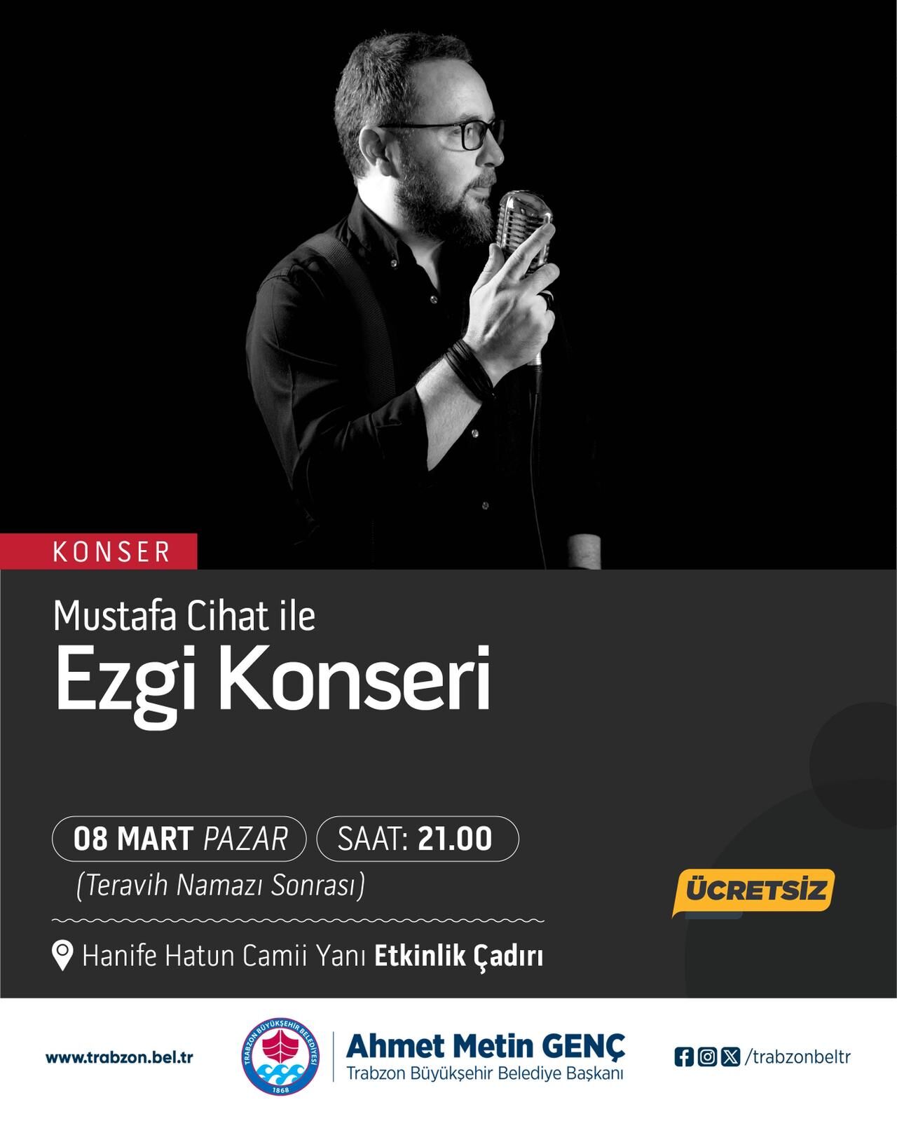 Ramazan etkinliklerinin en dikkat çeken bölümlerinden biri tasavvuf müziği konserleri oluyor. Program kapsamında birçok sanatçı Trabzonlu vatandaşlarla buluşacak. 10 Mart Salı günü saat 21.00’de sanatçı Mustafa Fidan tasavvuf müziği konseri verecek. 11 Mart Çarşamba günü ise sanatçı Hüseyin Sürer sahne alacak. Ramazan etkinlikleri 13 Mart Cuma günü düzenlenecek programla devam edecek. Bu kapsamda Murat Burçin Derinç ile İzmir Tasavvuf ve Klasik Türk Müziği Topluluğu Trabzon’da sahne alarak dinleyicilere unutulmaz bir müzik akşamı yaşatacak.