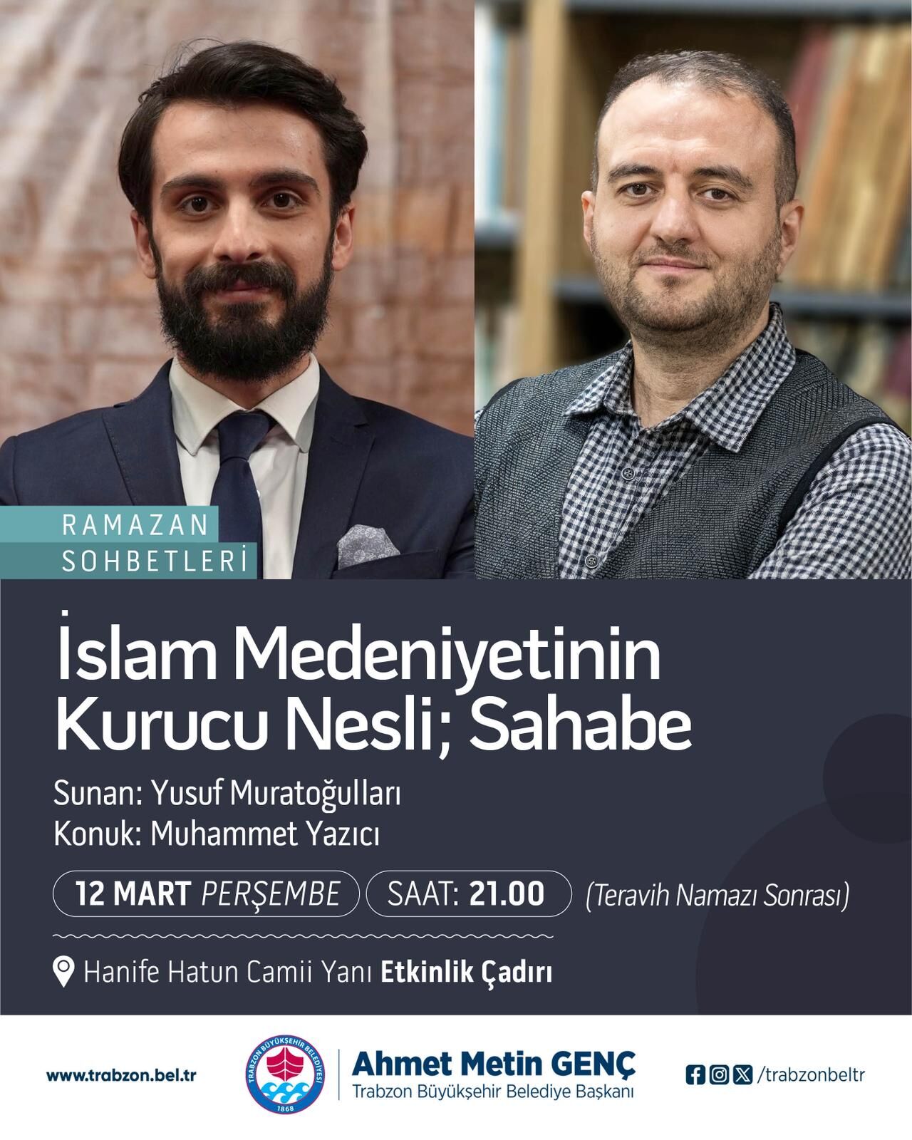 Ramazan ayının ruhuna uygun olarak düzenlenen sohbet programları da vatandaşlardan büyük ilgi görüyor. 9 Mart Pazartesi günü gerçekleştirilecek Ramazan sohbetlerinde “Türkiye’nin Kalkınmasında Gençlerin Rolü” konusu ele alınacak. Programın moderatörlüğünü Yusuf Muratoğulları yapacak. Söyleşinin konuğu ise Karadeniz Teknik Üniversitesi Rektörü Prof. Dr. Hamdullah Çuvalcı olacak. 12 Mart Perşembe günü düzenlenecek söyleşide ise Muhammet Yazıcı, “İslam Medeniyetinin Kurucu Nesli: Sahabe” başlıklı konuşmasıyla vatandaşlarla buluşacak.