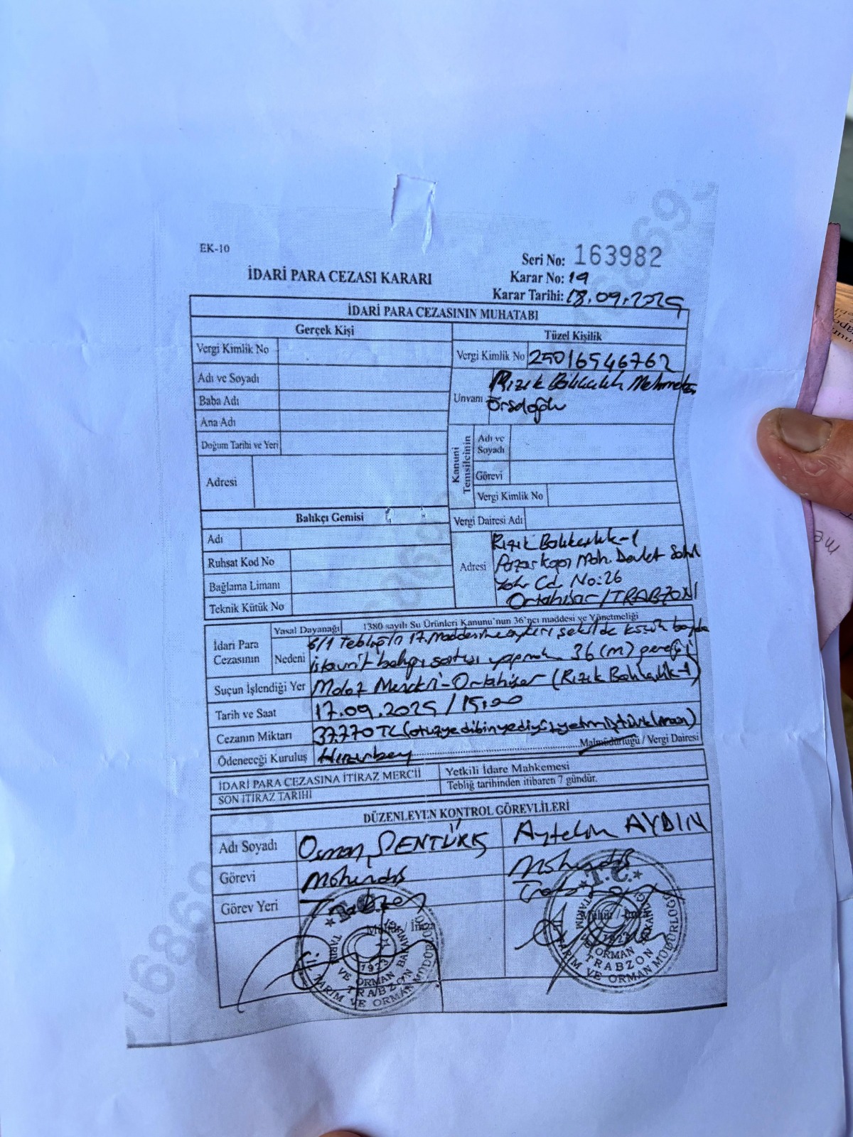 Trabzon’un Ortahisar ilçesinde faaliyet gösteren balıkçı esnafı, Tarım ve Orman İl Müdürlüğü ekiplerinin yaptığı denetimlerin ardından beklenmedik bir durumla karşılaştı. Denetim sırasında herhangi bir olumsuzluk tespit edilmediğine dair imzalı tutanaklar verilmesine rağmen, 48 saat sonra 11 balıkçıya toplam 415 bin 470 TL idari para cezası kesildi.