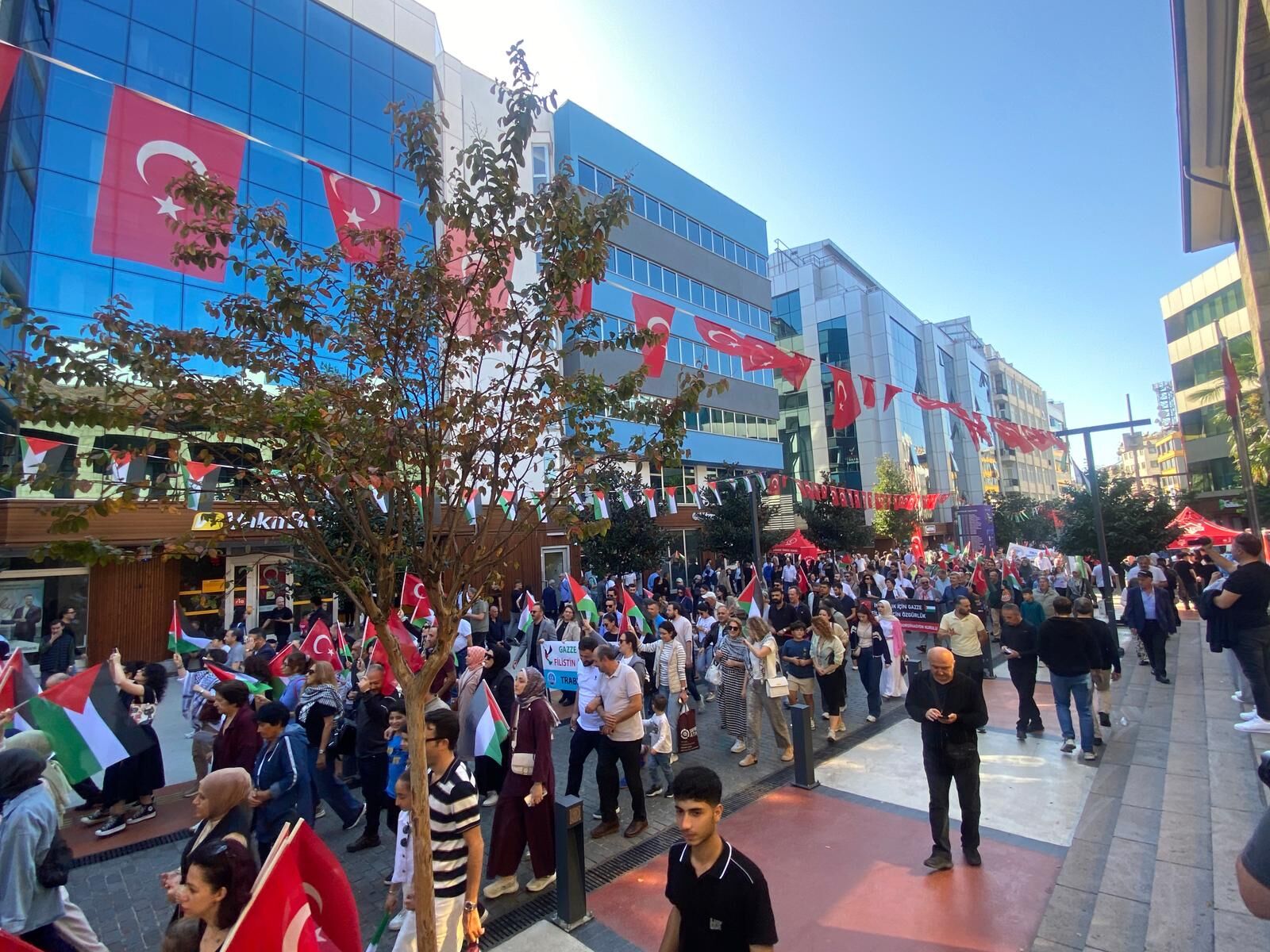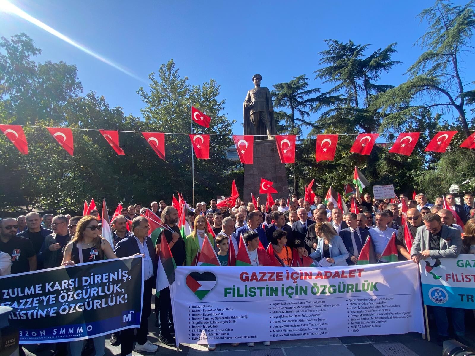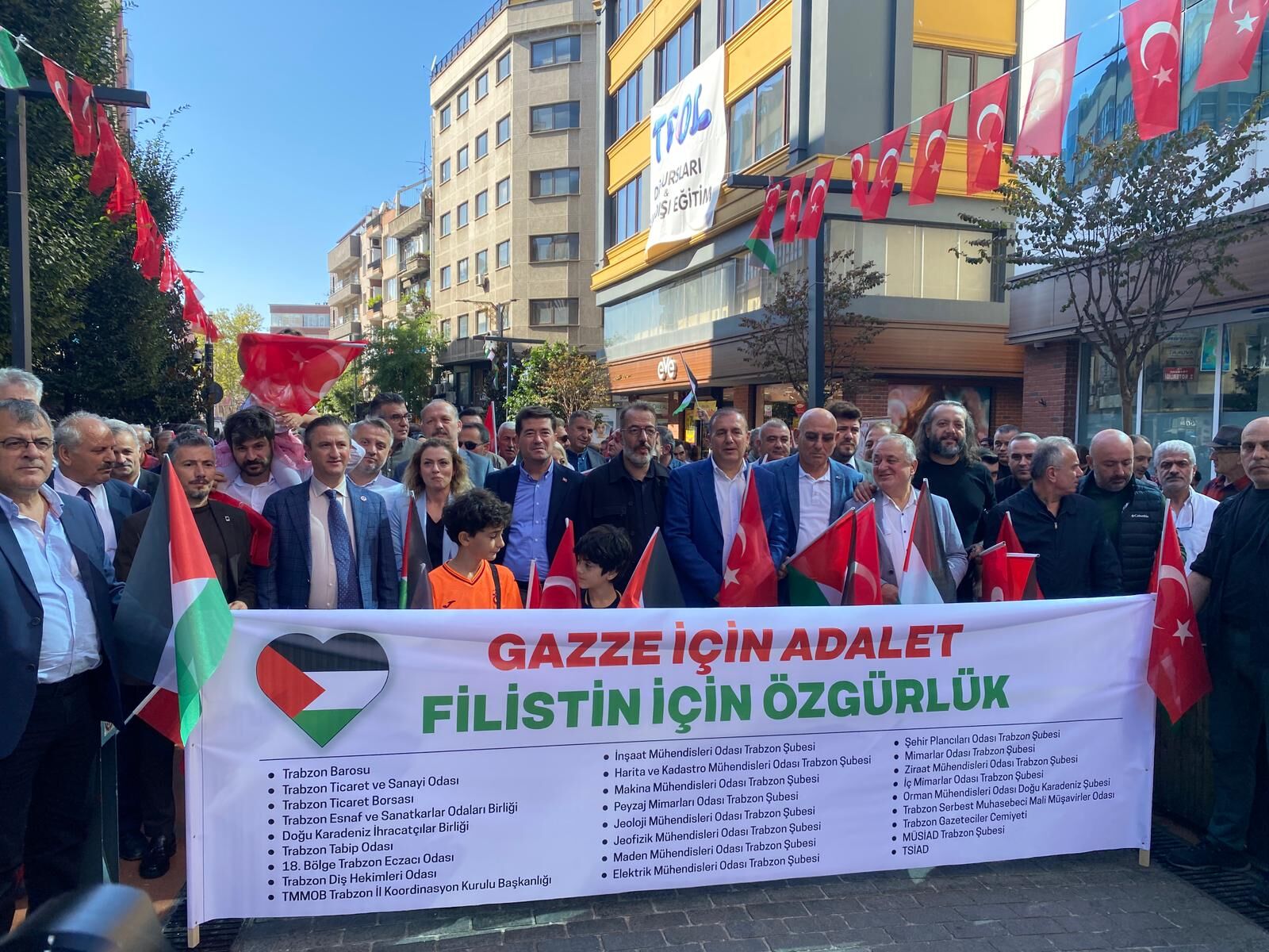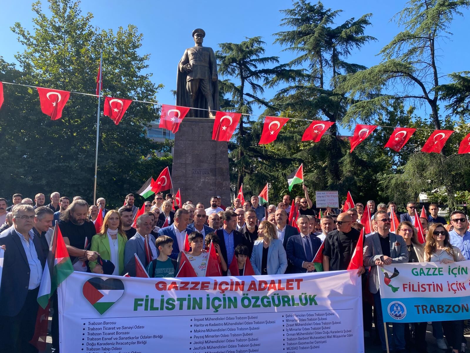 Trabzon Barosu, Ticaret ve Sanayi Odası, Tabip Odası, Eczacı Odası, TESOB ve Dış Hekimleri Odası başta olmak üzere 20’den fazla meslek ve sivil toplum kuruluşu yürüyüşü destekledi. Yerel yöneticiler, oda ve dernek başkanları ile sivil toplum temsilcilerinin omuz omuza yürüdüğü eylem, kent merkezinde yoğun ilgi gördü. Katılımcılar, kortej halinde Atatürk Alanı’ndan başlayıp şehir merkezinde barış ve insani yardım taleplerini içeren pankartlarla yürüdü; gerçekleştirilen eylem, Trabzon kamuoyunda geniş yankı buldu.