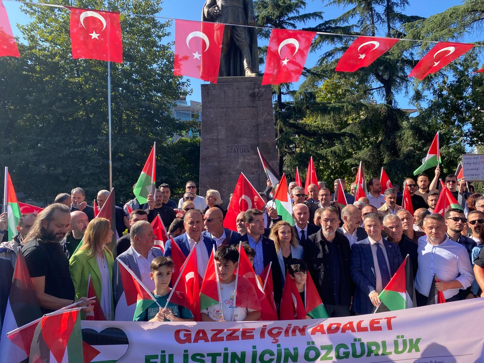 Geniş katılımlı bir dayanışma yürüyüşü için Trabzonlular Atatürk Alanı’nda buluştu. Ortahisar Belediye Başkanı Ahmet Kaya, TTSO Başkanı Erkut Çelebi, Trabzon Barosu’ndan Av. Hakan Orhan, Oteller Birliği Başkanı Mustafa Aksu ile 20’den fazla meslek ve sivil toplum kuruluşunun temsilcileri, Gazze’deki insani krizin sona ermesi çağrısıyla sokaktaydı. Yürüyüş boyunca katılımcılar, insani yardımın engelsiz ulaştırılması ve sivillerin korunması taleplerini dile getirdi. Etkinlik, ortak açıklama ve taleplerle son buldu; bölgeye yönelik farkındalık ve destek mesajları siyasetin ötesinde yankılandı.