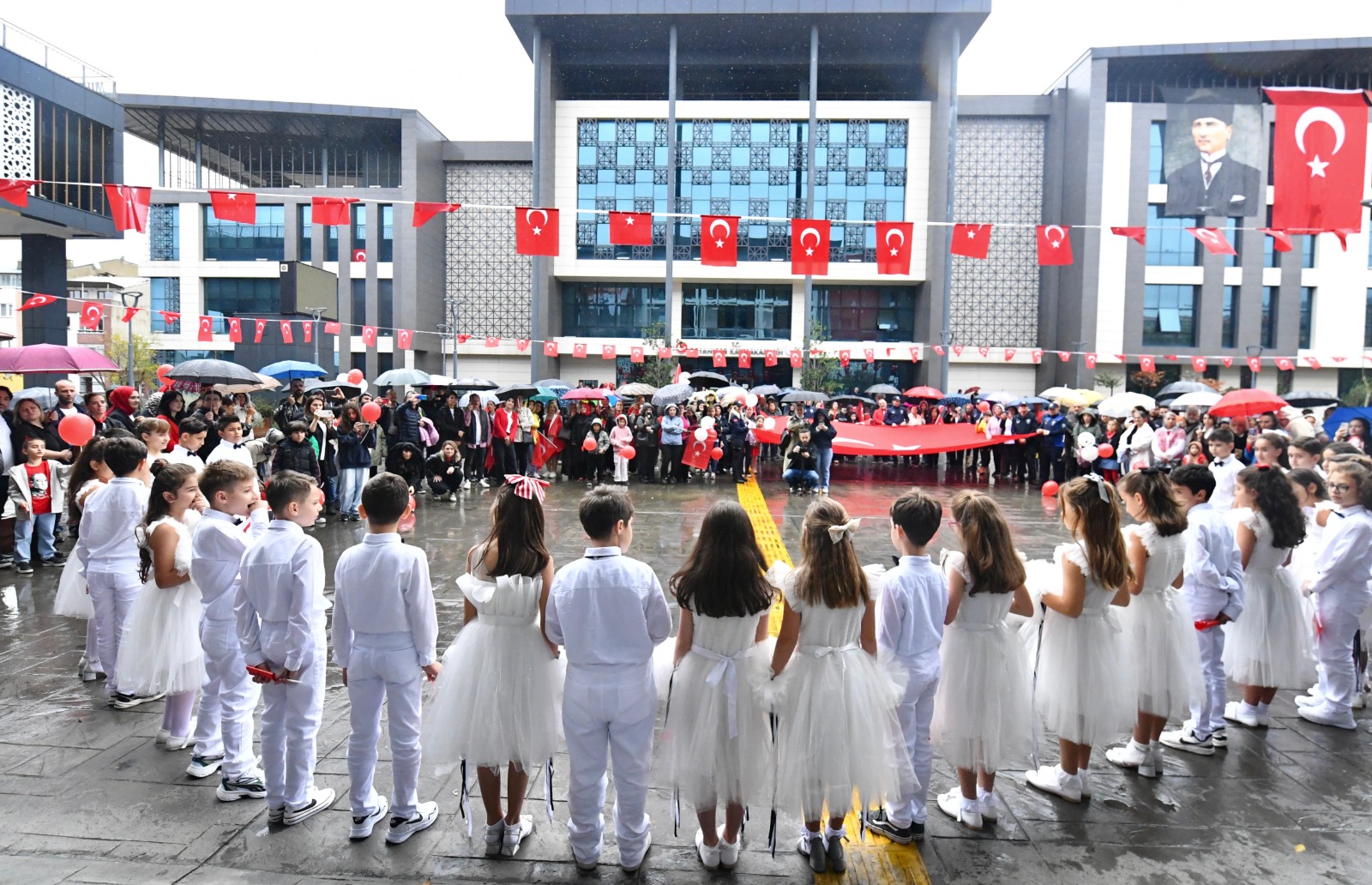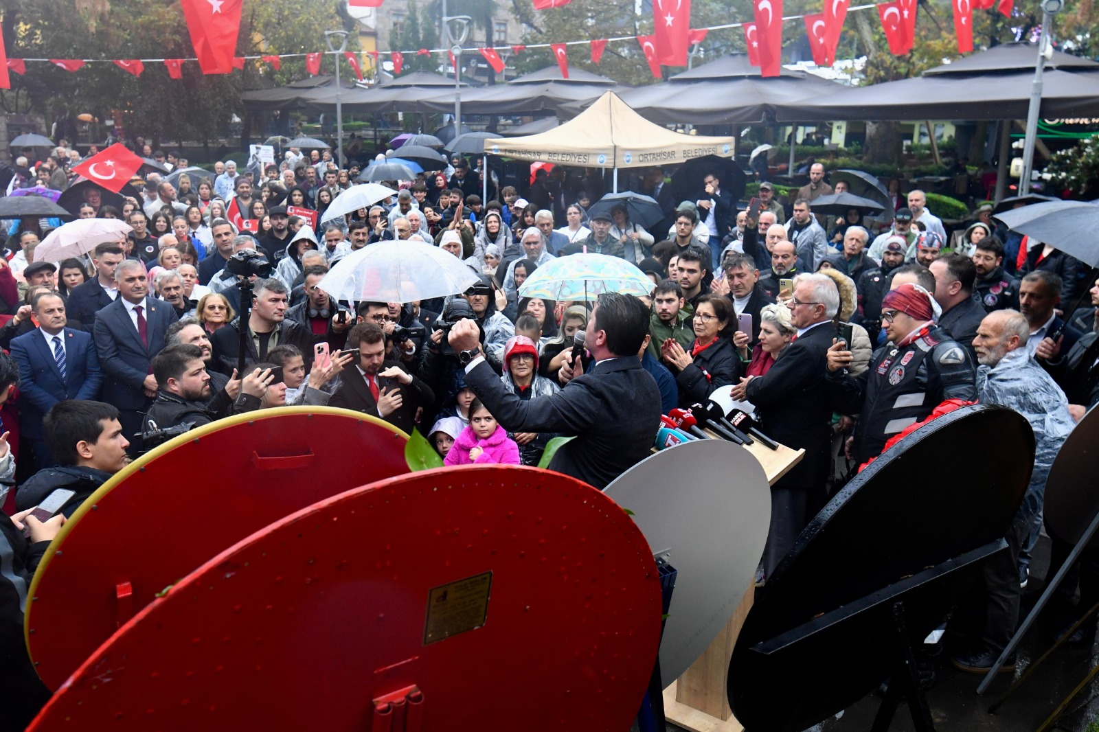 Yoğun yağmur altında kutlamalara katılanlara seslenen Başkan Kaya, “Birazcık ıslandık diye hemen sitem etmeye başladık değil mi? Oysa bu toprakları bizlere vatan yapan insanlar, ölümü göze alarak, yağmur-çamur, kar-kış demeden, elde avuçta var-yok demeden, bu toprakları bizlere vatan yapmak için canlarını ortaya koydular. Başta Gazi Mustafa Kemal Atatürk olmak üzere, bütün silah arkadaşlarını, bu Cumhuriyeti bizlere armağan eden bütün o yüce insanları saygıyla, rahmetle, minnetle anıyorum. Hepinizin Cumhuriyet Bayramı’nı kutluyorum” dedi.