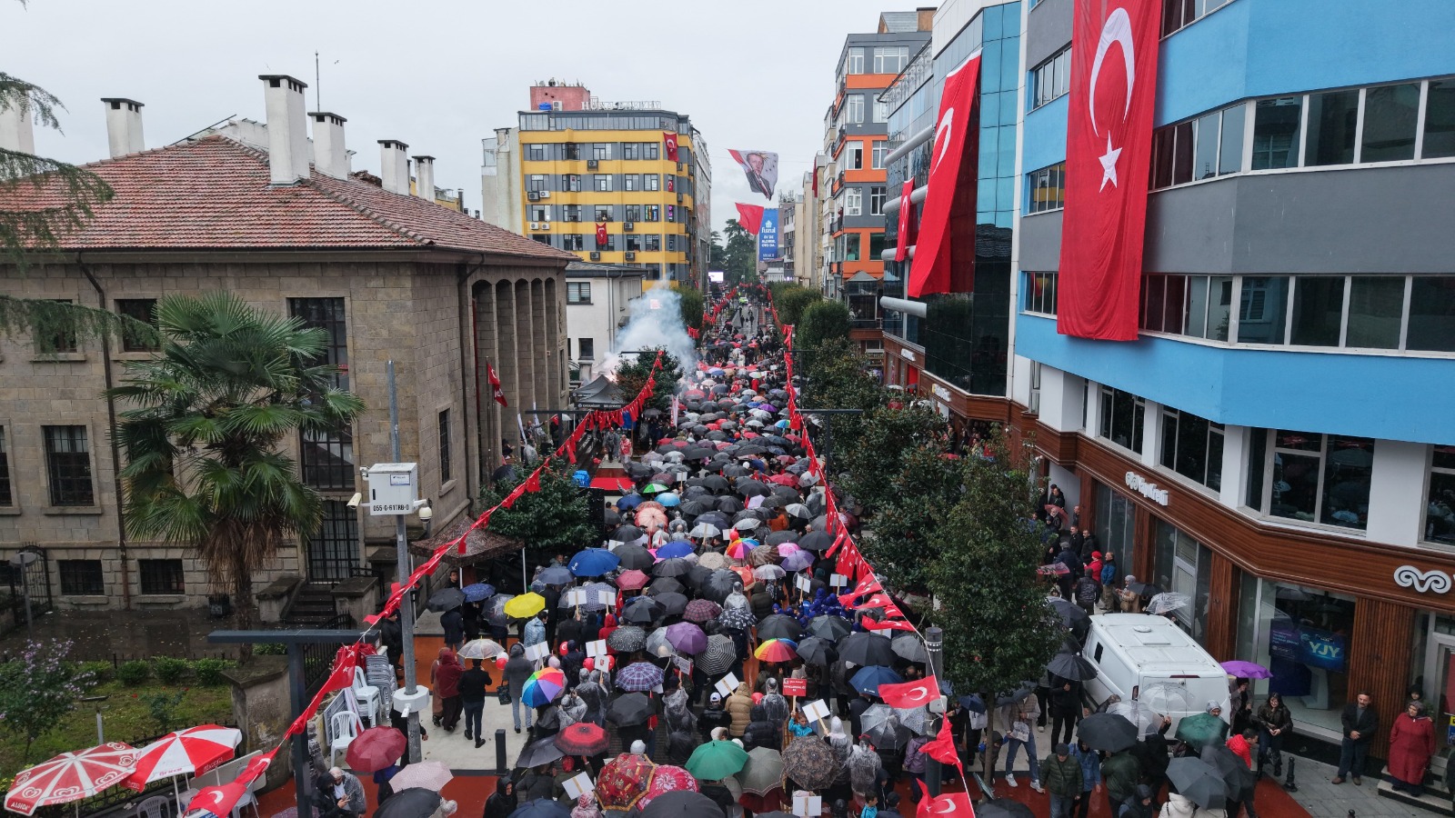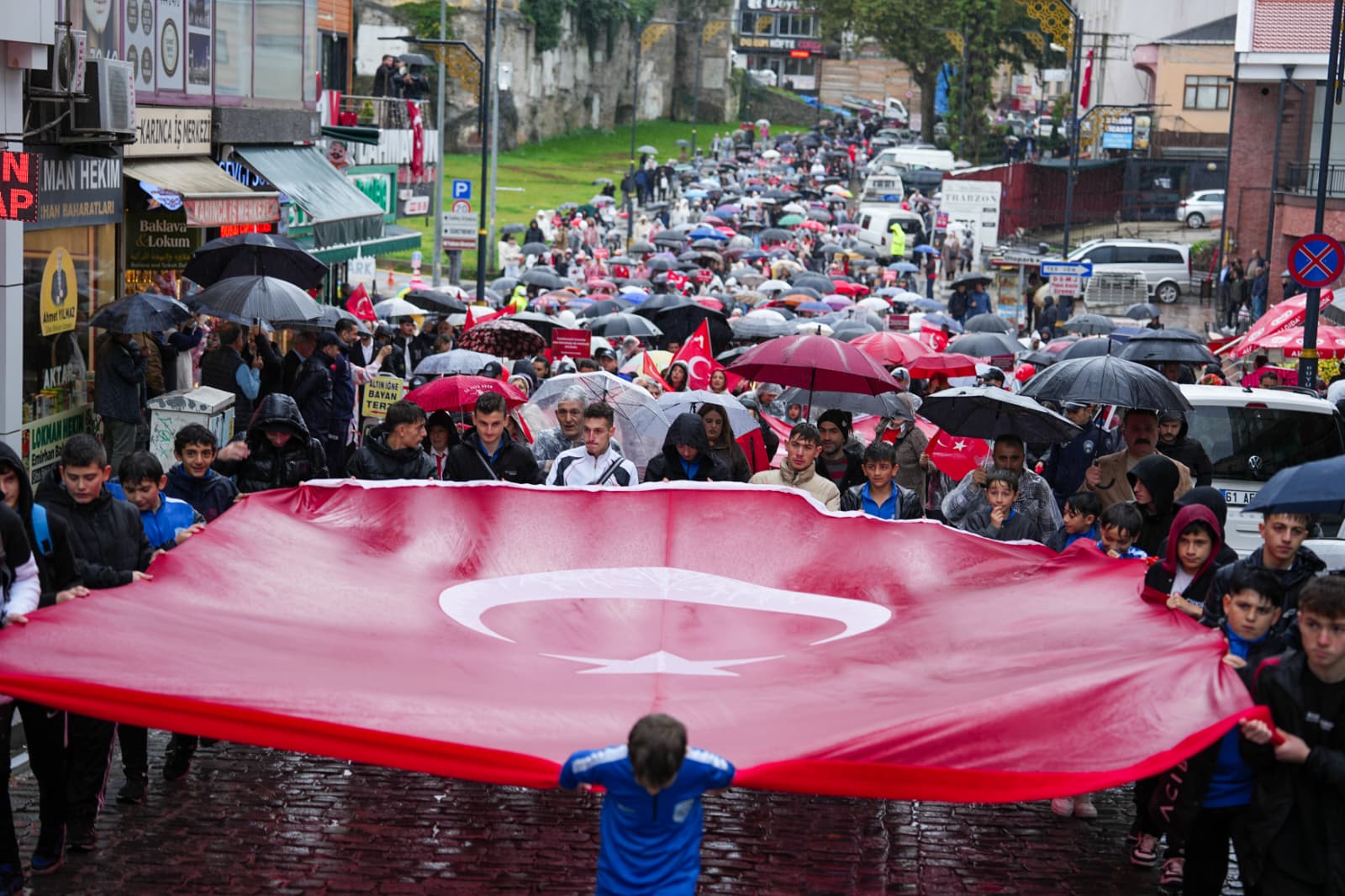 Ellerinde Türk bayrakları ve Atatürk posterleriyle, marşlar ve sloganlar eşliğinde büyük bir coşkuyla yürüyen korteje, Trabzon halkı da büyük ilgi gösterdi.