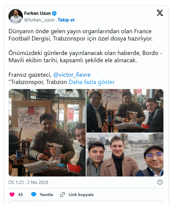 Dünyanın önde gelen yayın organlarından olan France Football Dergisi, Trabzonspor için özel dosya hazırlıyor. Fransız gazeteci, Victor Fievre, Bordo-Mavili ekibin, Cumartesi akşamı oynayacağı Galatasaray karşılaşmasını Şenol Güneş Spor Kompleksi'nden takip edecek.