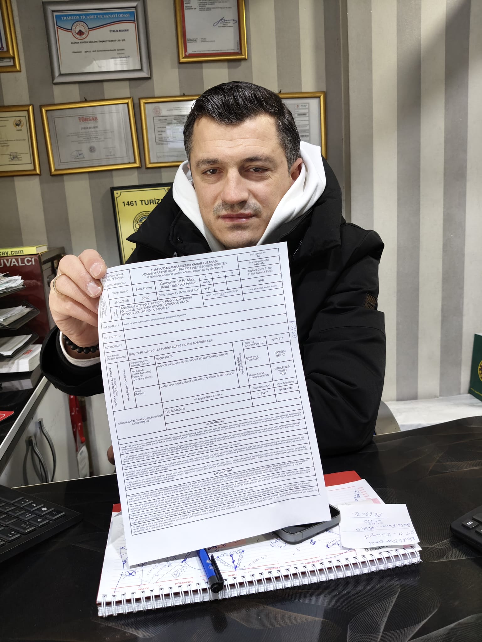 Trabzon’da turizmcilik yapan Zağnos Tur sahiplerinden Barış Çuvalcı’nın ofisinde çay içiyorduk. Gözümüz bir anda masa üzerindeki trafik idari para cezası tutanaklarına ilişti. Çok sayıda trafik cezası vardı. İşyeri sahibi Barış Çuvalcı’da cezalardan mustarip olduğunu dile getirdi. Bir ceza tutanağını bize gösterdi ve şunu dedi: “Aracımız Anadolu Otoyolu’nda ilerlerken önünden giden TIR’a selektör yaparak sollamaya geçti. Hemen arkasından bir trafik cezası geldi. ‘Aksine bir işaret bulunmadıkça trafiği aksatacak şekilde şerit değiştirmek’ maddesinden 2 bin 167 TL’lik ceza tutanağı geldi. Buna anlam veremedim. Devletimizin paralı otoyolunda araç sollarken kesilen ceza keyfi bir uygulamadır. Devlet bizi çalıştırmamak için elinden geleni yapıyor. Bu şekilde 10 tane ceza gelse kazancımız cezalara gidecek. Bir düzenleme bekliyoruz.”