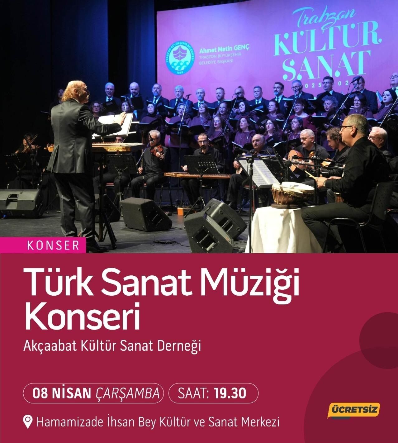 Akçaabat Kültür Sanat Derneği’nin şef Özdemir Hafızoğlu yönetimindeki Türk Sanat Müziği Korosu bu akşam Hamamizade İhsan Bey Kültür Merkezi’nde konser verecek.