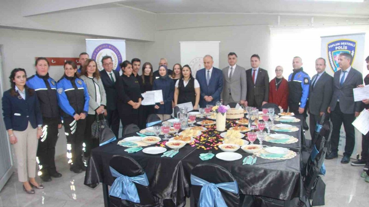 Emniyet Genel Müdürlüğü Asayiş Daire Başkanlığı koordinesinde, İl Emniyet Müdürlüğü Toplum Destekli Polis Şube Müdürlüğü ile İl Milli Eğitim Müdürlüğü tarafından yürütülen ‘Huzurlu Şehrin Bilgili Gençleri’ adlı ÇOGEP projesi kapsamında Aşçı Yardımcılığı Kursu düzenlendi. Kurs kapsamında 2 ay eğitim alan kursiyerler, kurs öğretmeni ile birlikte hazırladıkları yemeklerin sunum ve tanıtımlarını, Vali Muammer Erol ve protokol üyelerinin beğenisine sundu.
