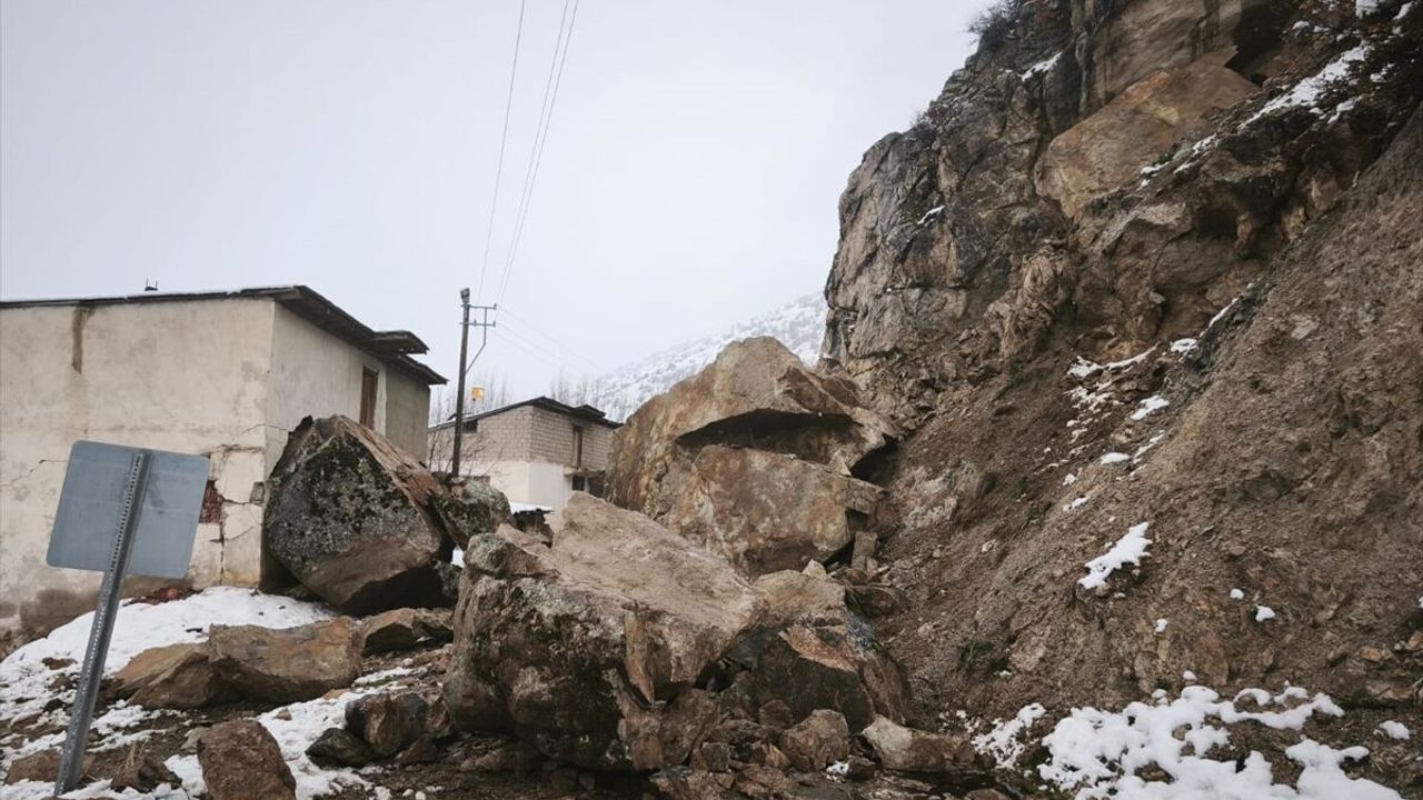 Yamaçtan kopan kaya parçaları ve toprak birikintisinin sürüklendiği köy yolu, ulaşıma kapandı.